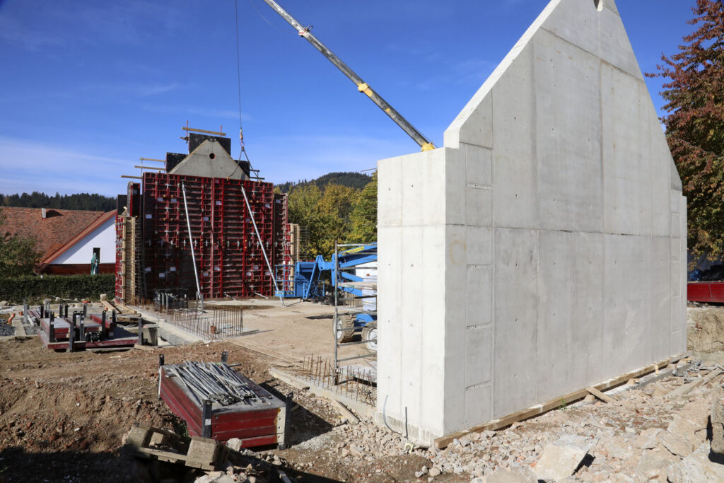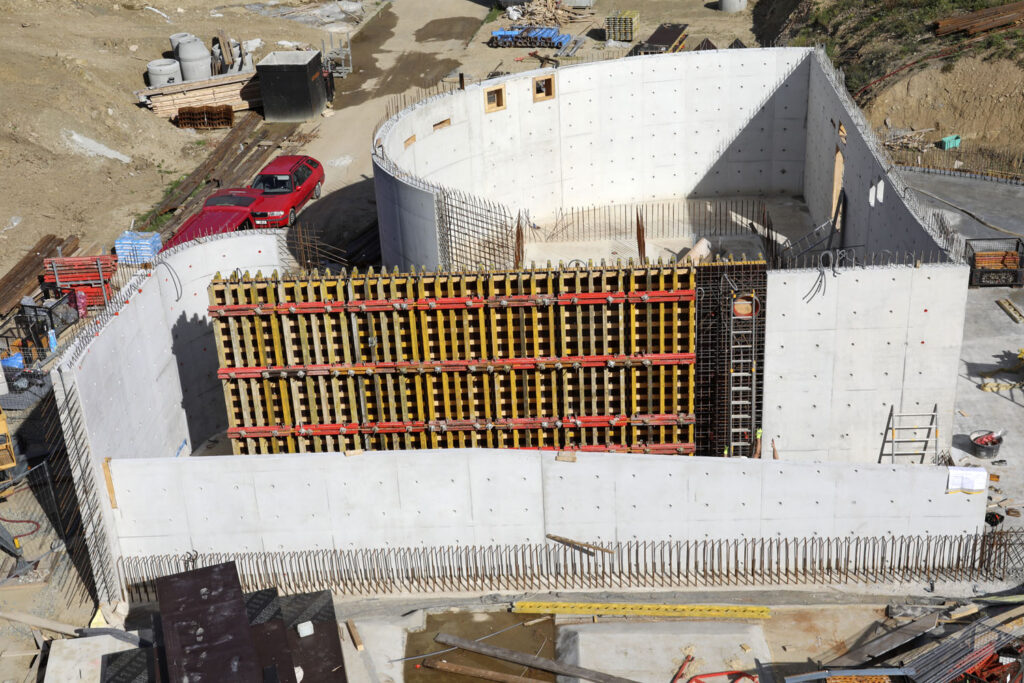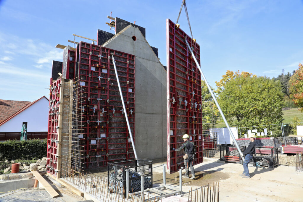 Na hlavní objekt byl připraven optimální návrh bednění z osvědčených systémů firmy PERI. Obvodové železobetonové stěny půdorysného elipsovitého tvaru byly řešeny nasazením panelů nosníkového stěnového bednění VARIO GT 24, které byly vzájemně spojeny kloubovými spojkami pro umožnění nastavení různých úhlů zakřivení mezi panely. Výšky stěn u tohoto objektu činily od 3,50 m do 5,40 m. Připravené samostatné panely bednění VARIO GT 24 byly poté nasazeny také na rovné železobetonové vnitřní stěny. Sloupy s výškou 3,50 m až 5,75 m byly bedněny systémem QUATTRO, který šetří čas využití jeřábu na stavbě, protože lze celý sloup včetně stabilizátorů a betonářské plošiny přemístit najednou.