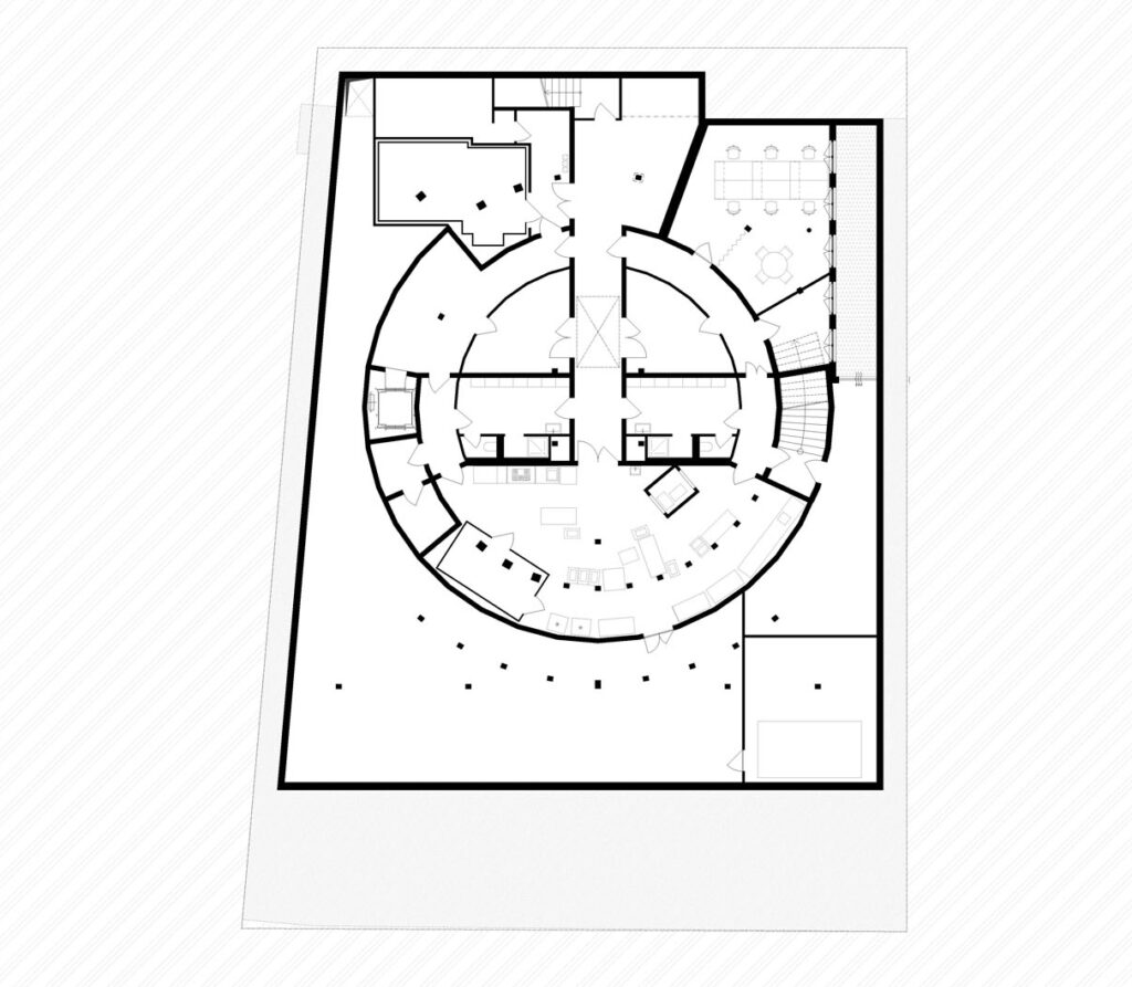 K cestě směrem dolů slouží dvě schodiště vetknutá do dutiny zdvojených stěn válce, ústí v parteru. Jedno z nich je určeno pro návštěvníky, druhé je služební. Centrální tubus auditoria slouží jako multifunkční sál. Jeho prostor s vnitřním průměrem 15,5 m se tyčí do výšky 12 m, koncipován byl jako tzv. black box. Rampa se sedadly v auditoriu kopíruje obvod návštěvnické cesty, přičemž hlediště a galerie jsou na několika místech propojeny. Díky tomu lze tyto prostory oddělit nebo spojit podle aktuálních potřeb.