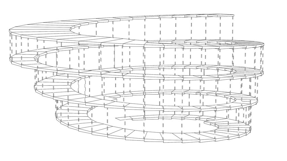 Konstrukci lze jednoduše popsat jako ve středu dispozice umístěnou dvouplášťovou trubku o výšce zhruba 12 m, s průměrem vnějšího pláště 9,7 m a průměrem vnitřního pláště kolem 6,7 m. Středová trubková konstrukce je osazena do betonové vany. V úrovni desky nad suterénem stropu nad přízemím i střechou je uvnitř a vně konstrukce vodorovná výztuha. V prostoru mezikruží vodorovné výztuhy tvoří konstrukce schodiště, podest a mezipodest. Na obvod nosné kruhové konstrukce se pak v radiálním směru osadily nosníky, částečně konzolově vyložené a částečně podepřené sloupy po obvodě konstrukce respektující konečnou fasádní stopu. Nosnou konstrukci tvoří CLT sloupy a panely Sylva od společnosti Stora Enso, pro vnější spirálu byly využity materiály Novatop Systém.