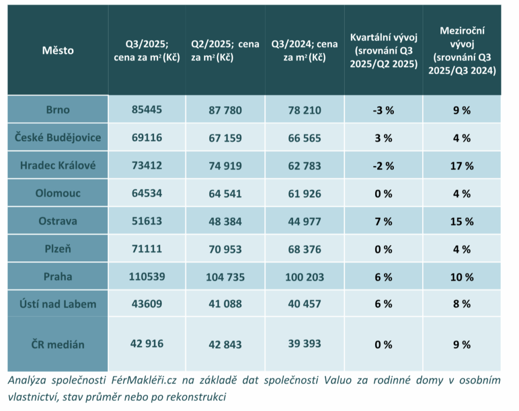 Ceny starších domů dál rostou. Meziroční porovnání ukázalo zdražení o 10 procent v Praze, o 9 procent v Brně a v Ostravě dokonce o 15 procent. Při krátkodobějším kvartálním srovnání už se v některých městech objevily náznaky korekce, nicméně konkrétně v hlavním městě domy zdražily o 6 procent i při srovnávání čtvrtletí. Aktuálně se zde cena za metr čtvereční pohybuje kolem 110 540 korun. Vyplývá to z analýzy společnosti FérMakléři.cz na základě dat společnosti Valuo.