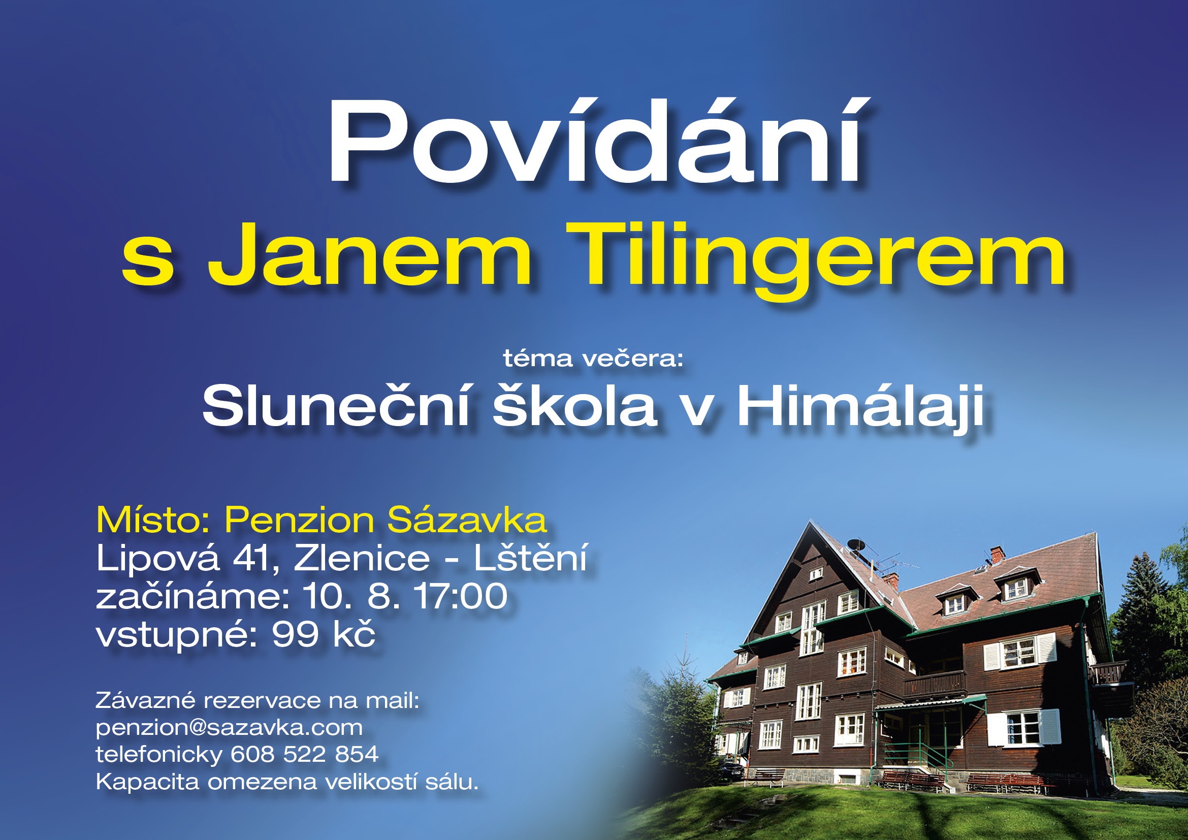 Jan Tilinger, pedagog, inženýr, fotograf a novinář, zakladatel Občanského sdružení Surya, které postavilo Sluneční školu v indické části Himálaje, vás provede svou cestou ke Sluneční škole. Povídání se koná 10. 8. 2014 od 17 h v penzionu Sázavka (Lipová 41, Zlenice-Lštění).