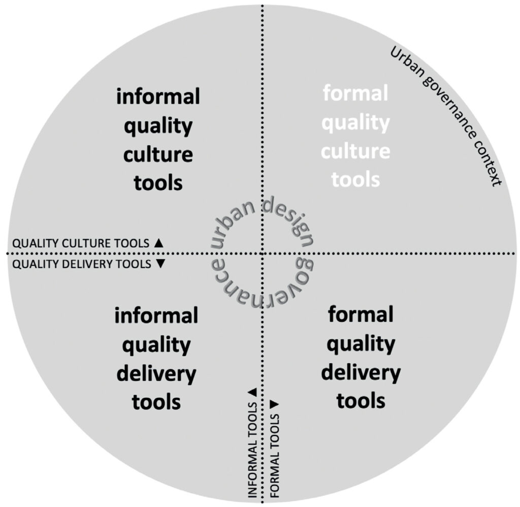 V článku Kvalita jako dohoda v čase3 jsme se seznámili s formálními a neformálními nástroji správy území. Nehledě na míru závaznosti je možné systém nástrojů dělit ještě druhou rovinou, na nástroje podpory kvalitní stavební kultury a na nástroje pro vytváření kvality prostředí. V kontextu správy území si můžeme všechny dostupné nástroje schematicky rozmístit v kruhu, rozděleném na čtyři segmenty:4