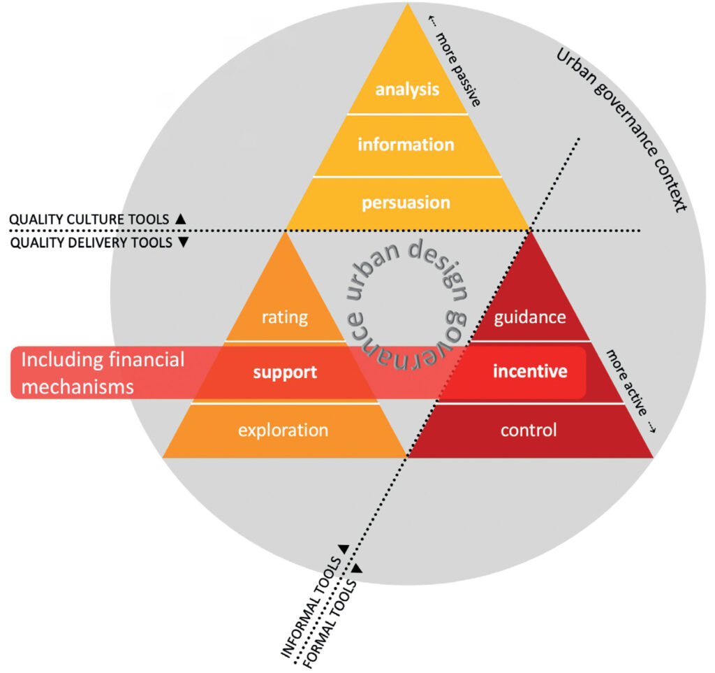 Formální nástroje podpory kvality stavební kultury se podle Carmony týkají především institucí pro vzdělávání a zvyšování obecného povědomí.5 Schéma nástrojů správy území proto můžeme zjednodušit na tři segmenty. V oblasti nástrojů pro vytváření kvality místa vidíme zvýrazněné finanční nástroje.6