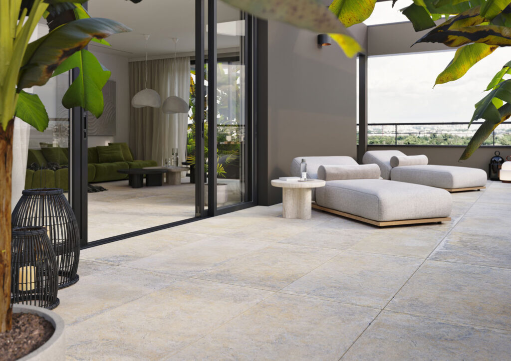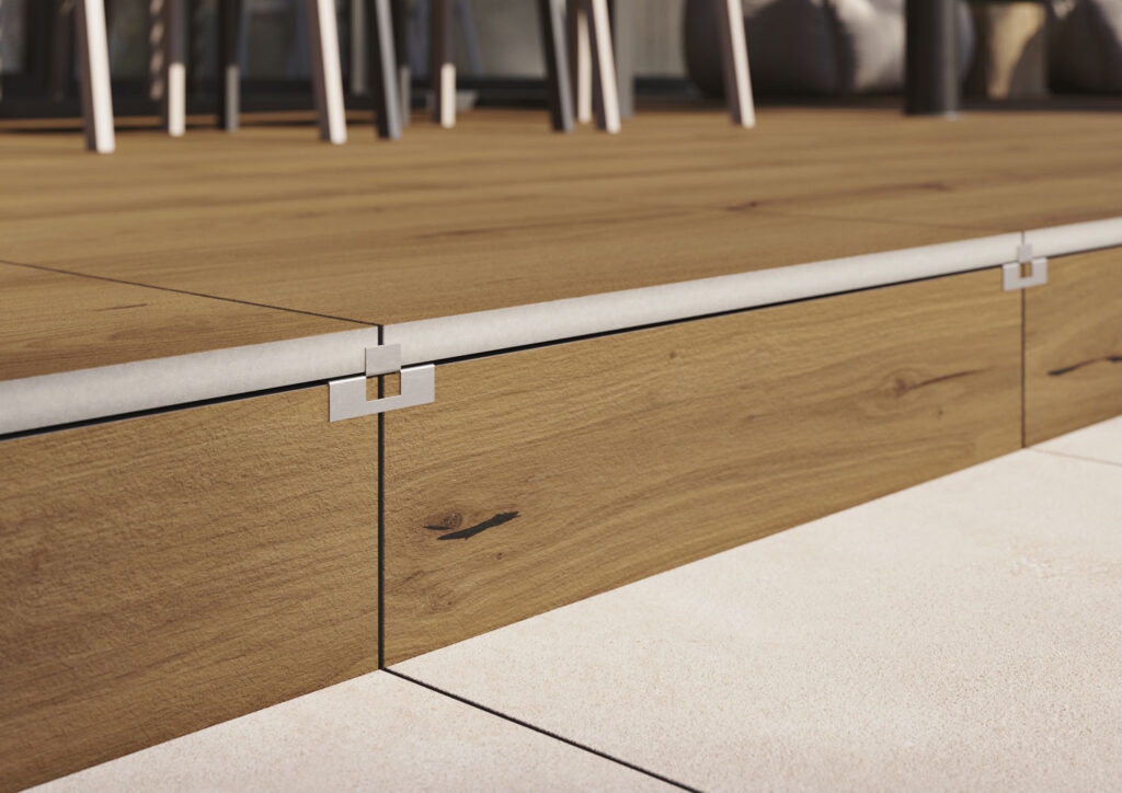 S dobou jdou nejen designy keramických podlah pro interiéry, ale i venkovní keramické dlaždice. Díky tomu, že designově odpovídají podlahovým sériím, umožňují, aby vzhled interiéru s exteriérem na sebe dokonale navazoval. Vysoce slinuté keramické dlaždice RAKO OUTDOOR 60 x 60 cm a nově ve formátu 60 x 120 cm se zesílenou tloušťkou 2 cm nacházejí využití nejen na balkonech, střechách, terasách, v okolí bazénu, v pergolách, nebo jen jako nášlapné chodníky zakomponované do travní plochy. Pokládka je jednoduchá, bez použití lepidel a další stavební chemie, navíc umožňuje vyjmutí dlaždic pro možné opravy či úpravy. Vyvýšená keramická podlaha na terčích umožňuje skrýt elektrické instalace, potrubí a kabely pod podlahou, a tím vytvořit prostor bez viditelných technických prvků.