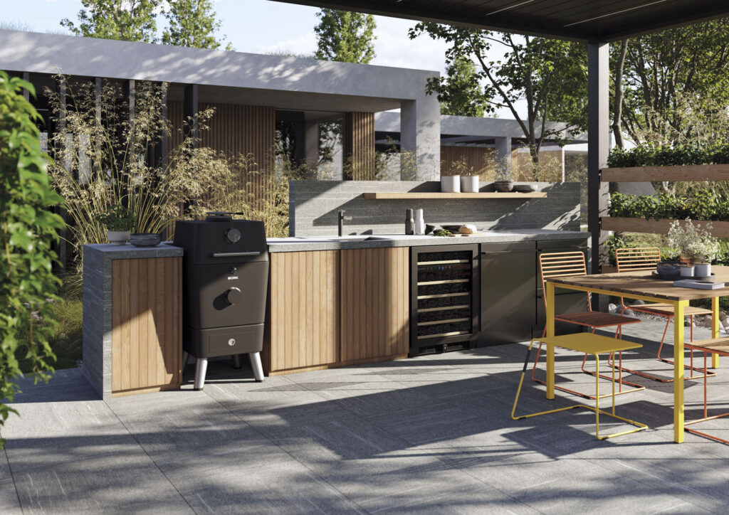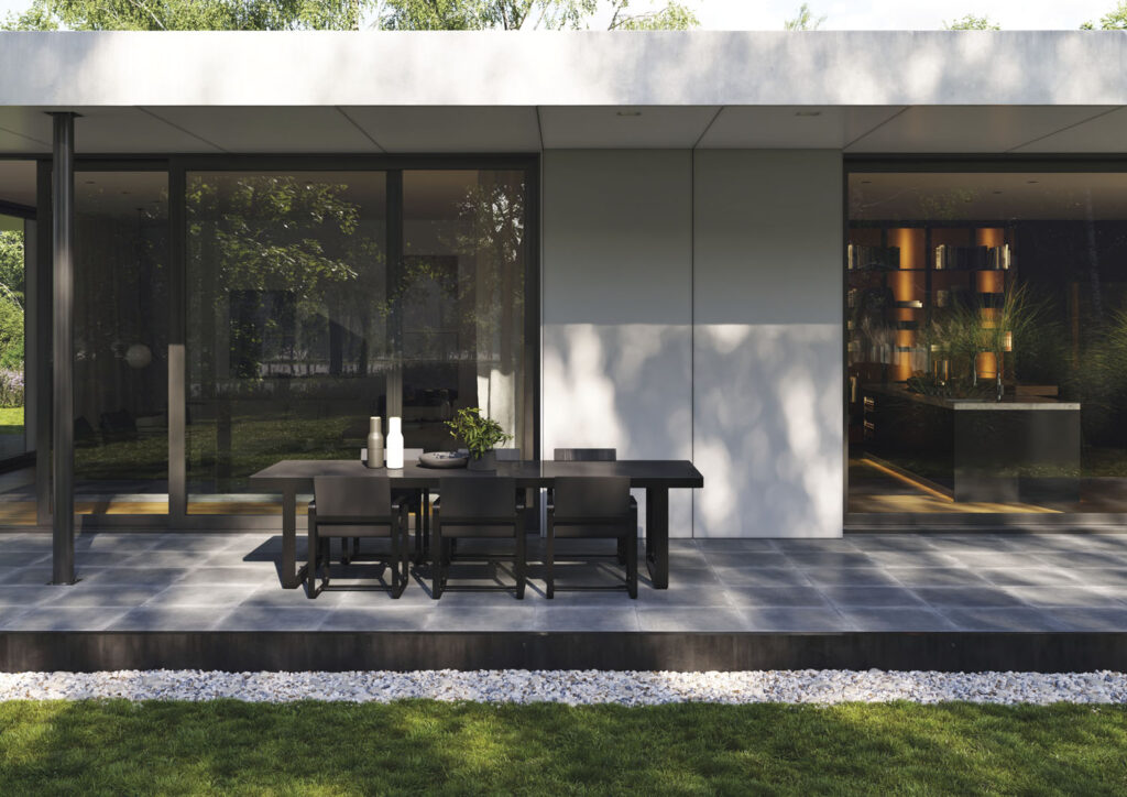 Nové venkovní dlaždice RAKO OUTDOOR ve formátu 60 x 120 x 2 cm se vzhledem betonu i dřeva.