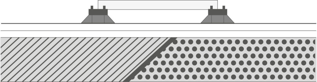 - Hodí se i pro tzv. problémové terasy, např. se starým betonem, který bychom jen těžko sanovali, případně s vysokými náklady na odstranění původní betonové desky. Pokud je beton hrubý, pod PVC fólii vložíme geotextilii. Tím předejdeme jejímu proražení pod tlakem terčů.