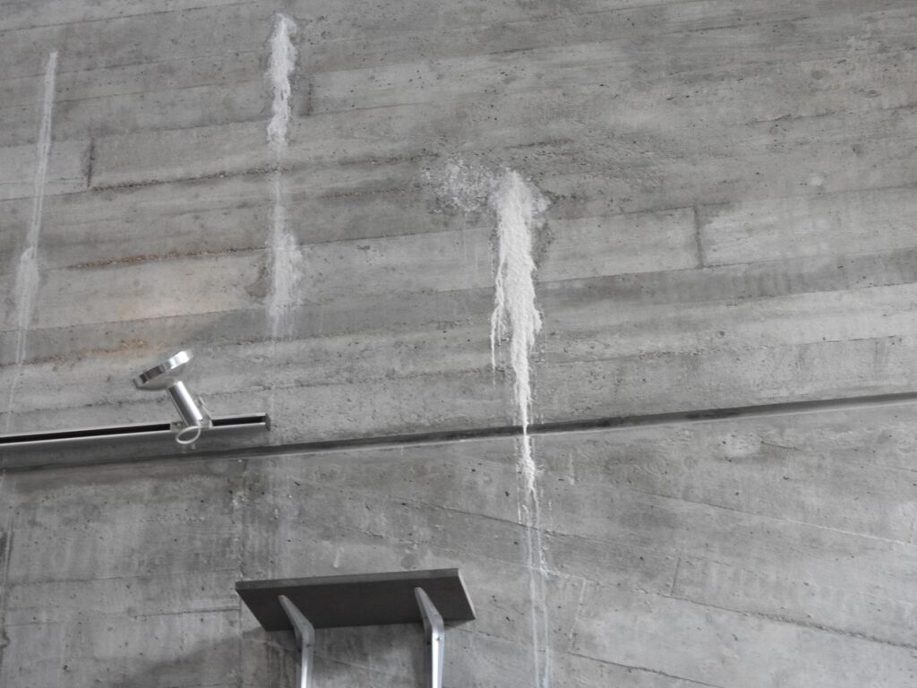 Je třeba vzít v úvahu, že po odbednění při zrání betonu dochází k nastavování jeho rovnovážné vlhkosti (vysychání). Vynášená přebytečná záměsová voda z kapilárního pórového systému však obsahuje vápenné ionty, které na povrchu reagují se vzdušným oxidem uhličitým a vzniká tak světlý/bílý uhličitan vápenatý.