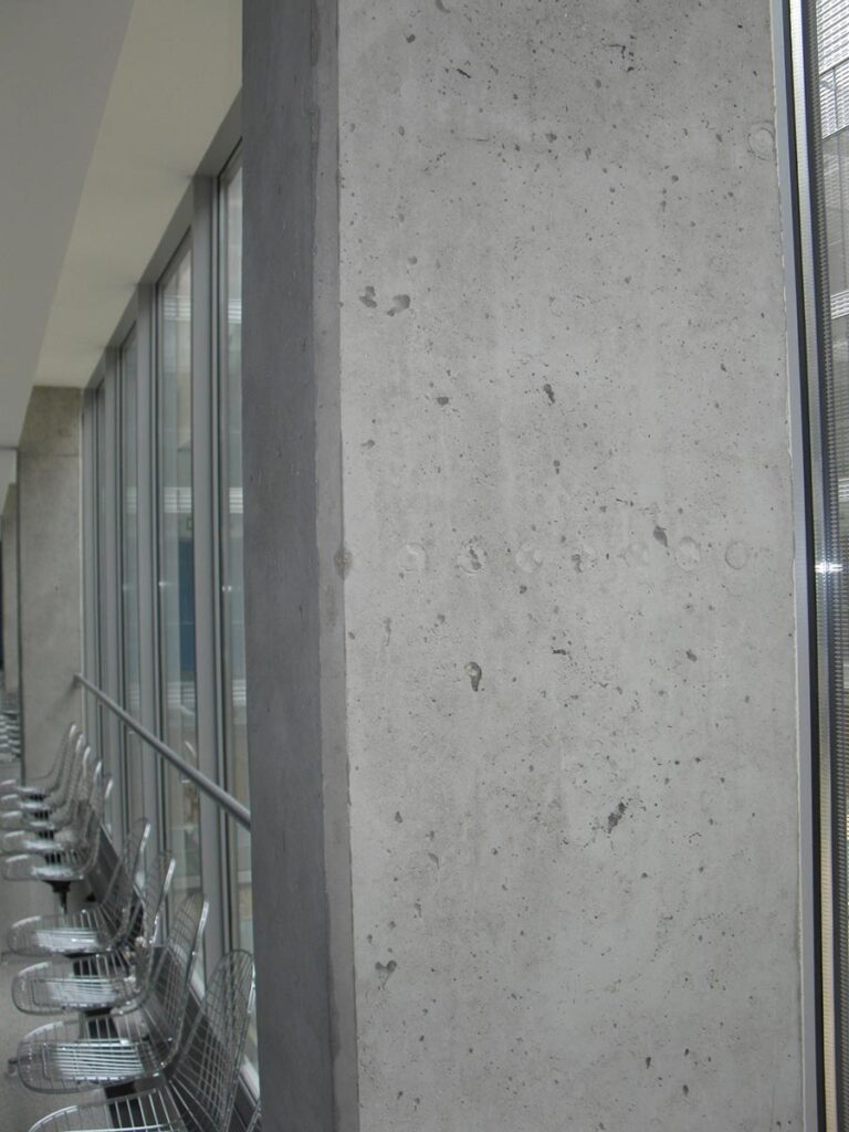 V nedávno dobudovaném justičním areálu na Praze 10 lze zachytit na sloupech výrazné póry, které nepochybně přestupují požadavky kategorie pohledového betonu PB2 i PB3, a přesto byly akceptovány bez toho, aby vnější prostory esteticky utrpěly (obr. 8 ,9).