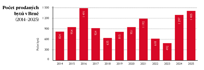 Brno – Rok 2025 se zařadil mezi nejúspěšnější v historii brněnského realitního trhu. Podle dat společnosti Trikaya, která trh dlouhodobě sleduje, se v průběhu roku v moravské metropoli prodalo 1 405 nových bytů, což představuje nejvyšší roční objem prodejů za posledních téměř deset let. Zároveň výrazně vzrostly ceny – průměrná nabídková cena novostaveb ve čtvrtém čtvrtletí překročila hranici 145 tisíc korun za metr čtvereční, což představuje meziroční nárůst o 11 procent.
