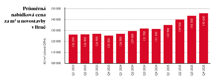 Průměrná nabídková cena za metr čtvereční se od lednových 133 600 Kč postupně vyšplhala až na 145 700 Kč v prosinci. Podobný vývoj zaznamenaly i prodejní ceny – zatímco na začátku roku se byty prodávaly přibližně za 128 tisíc korun za metr, na jeho konci už atakovaly hranici 137 tisíc korun.