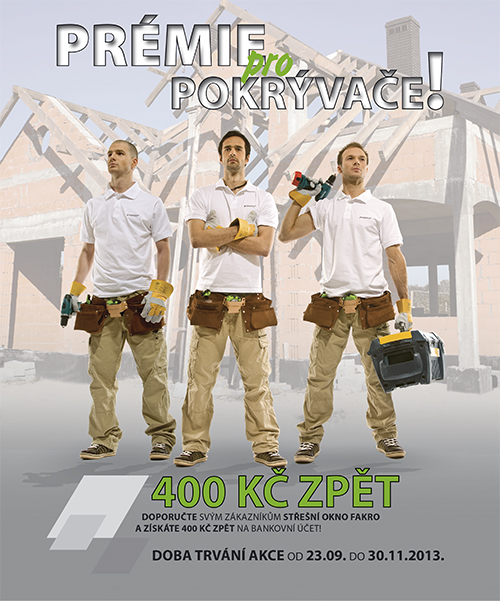Ve dnech 23. 9.–30. 11. 2013 probíhá akce Prémie pro pokrývače. Za každé jedno okno FAKRO zahrnuté do Akce pokrývač (či realizační firma zastupovaná kontaktní osobou) získá 400 Kč zpět na bankovní účet.