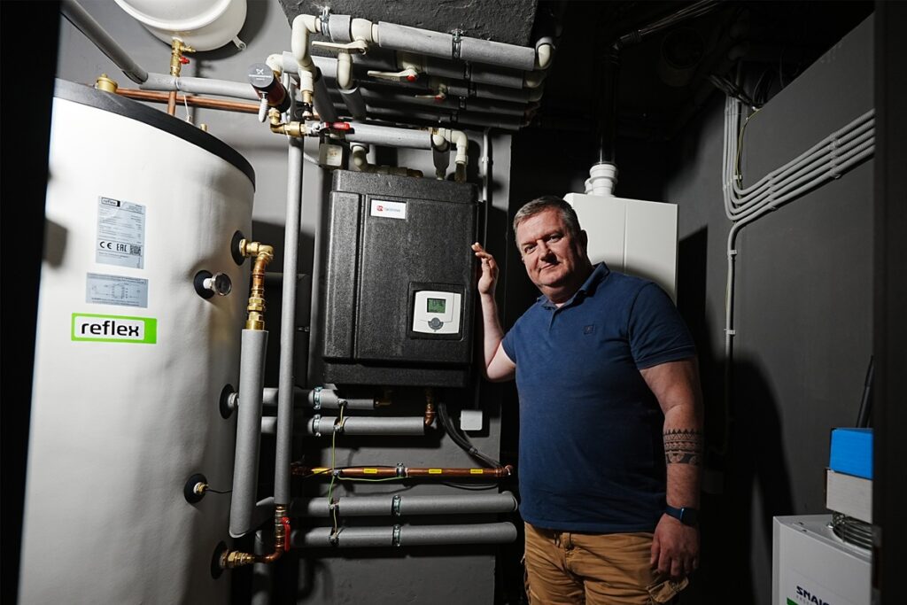 V okamžiku, kdy se začnou napouštět kádě nebo když se zákazník začne sprchovat, senzory v systému detekují průtok, aktivují čerpadlo a spustí ohřev vody přes deskový výměník. Studená voda proudící sekundárním okruhem se okamžitě ohřívá teplem z akumulační nádrže. Hystereze čidel je nastavena na 7 °C, takže při poklesu teploty zásobníku pod 63 °C systém automaticky dohřívá vodu zpět na 70 °C.