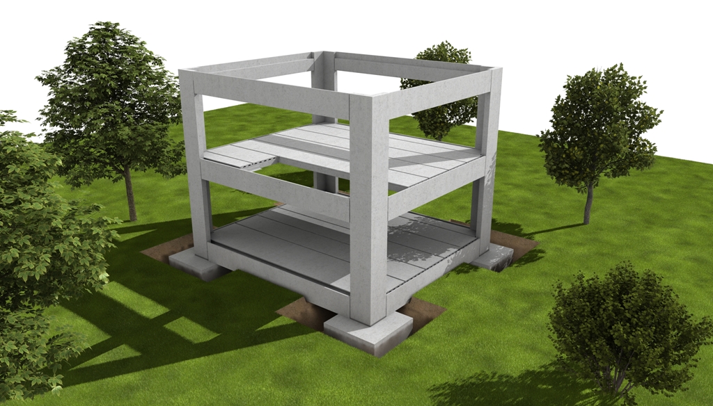 Založení hrubé stavby je řešeno pouze bodovými podporami – monolitickými základovými patkami. Základová deska řeší nejen samotné založení objektu, ale i bezprostředního okolí. Konstrukční soustava nevyžaduje odstranění skrývky pod budovaným objektem ani v jeho nejbližším okolí. Způsob založení hrubé stavby zajišťuje zvýšenou ochranu objektu proti radonu, zemní vlhkosti, při zvýšené hladině spodních vod nebo při povodňových událostech.