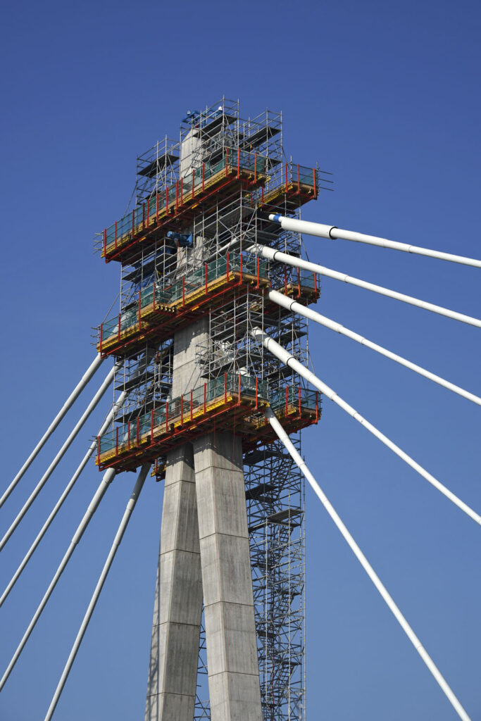 Po dokončení výstavby pylonu pokračovaly aktivity PERI na stavbě s konstrukcemi lešení PERI UP pro zajištění bezpečných přístupů k dalším fázím výstavby mostu. Ve finální fázi výstavby byly využity plošiny pro předpínání betonové konstrukce a lávky pro nasazení přepínacích lan ve třech úrovních pro obsluhu a usazení.