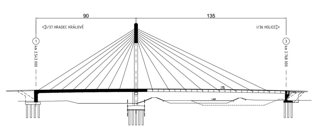 „Povodí požaduje volný přístup k toku Labe, to prakticky vyloučilo návrh elegantního obloukového mostu. Zbýval zavěšený most, případně se dalo uvažovat o mostě se dvěma pylony, ale to by bylo o něco nákladnější než most s jedním pylonem. Po zvážení všech možností lze hodnotit koncepci zadání jako rozumnou,“ uvádí dr. Petr Vítek ze společnosti Hochtief a dodává: „Konstrukční řešení jsme optimalizovali i ve vazbě na technologii výstavby. V době před podáním nabídky byla na trhu vysoká cena oceli, což vedlo k návrhu betonové konstrukce. Nemohli jsme tak využít rozdílu tíhy ocelové a betonové konstrukce k eliminaci rozdílu délek polí, jak tomu bylo v zadání. Ukládání balastu do kratšího pole jsme nepovažovali za efektivní a kotvení do podloží je pro tak velký most prakticky nereálné. Další úvaha vedla k symetrickému mostu se stejnou délkou polí, ale nakonec jsme zvolili řešení s délkami polí 122 + 135 m, kde je symetrická osnova závěsů. Tíhu chybějící délky mostovky v kratším poli jsme kompenzovali mohutným podporovým příčníkem, do kterého je zakotven nejdelší závěs. Nesymetrie s kotvením závěsu v příčníku přispívá k tuhosti konstrukce. Účelnost této koncepce byla zpochybňována, zejména s ohledem na jednoduchý výpočet ceny mostu z plochy mostovky. Z toho totiž vyplývalo, že delší most rovná se vyšší cena. Porovnáme-li však hlavní položky varianty s delším rozpětím proti variantě s balastem, zjistíme, že tento přístup vede k nesmyslnému závěru. Náklady na závěsy jsou na délce mostu prakticky nezávislé, rozhodující je cena kotevního systému a sedel na pylonu, nepatrná úspora délky lan není rozhodující. Máme-li mít vyvážený systém, pak spotřeba betonu je stejná. Podélné předpětí nakonec vychází obdobně, neboť kratší pole s balastem je těžší a vyžaduje relativně více předpětí. Zvýšené náklady prodloužení mostu jsou tedy především v betonářské výztuži a v příčném předpětí, bohatě je však kompenzuje nižší opěra a také úspora násypového materiálu.“