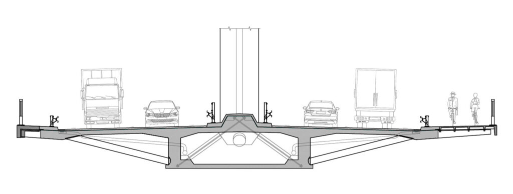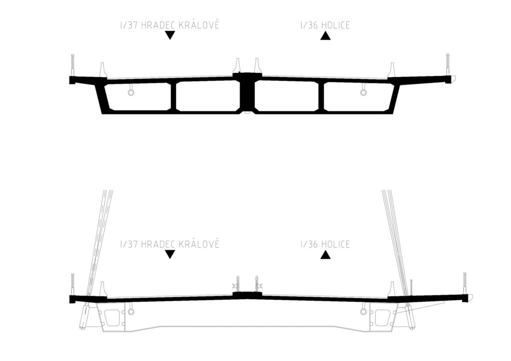 Most je jednokomorový s vyloženými konzolami, které podepírají prefabrikované vzpěry. V místech kotvení závěsů do mostovky se komora vyztužila šikmými předpjatými táhly, jež roznášejí svislé síly závěsů do jejích stěn. Pro předepnutí příčných táhel byl využit lanový systém se speciální kotvou v rozích komory: „Do kotvy se lana dodatečně kotvila až po betonáži komory. Táhla se předpínají z úrovně mostovky a kotevní objímky lze podkládat pro eliminaci prokluzu v kotvě. V prostoru středního dělicího pásu je umístěno ztužující žebro, které přispívá k roznosu vodorovných podélných sil ze závěsů,“ upřesňuje Petr Vítek.