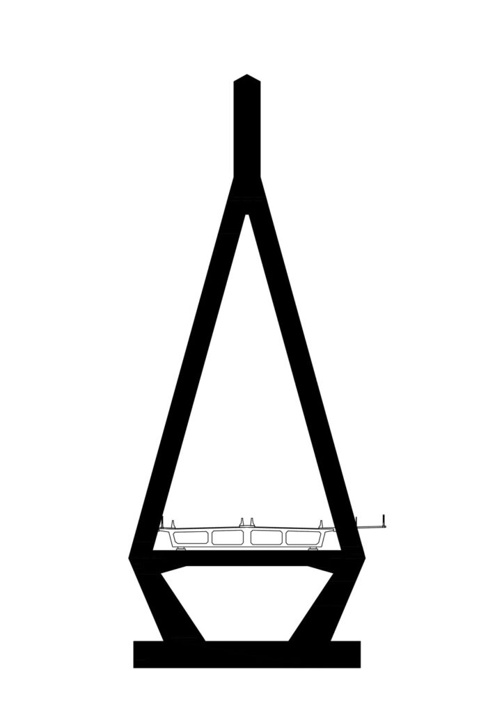Rozkročený tvar pylonu a užití sedel pro převedení závěsů vedou k minimalizaci namáhání konstrukce. Využití betonu na výstavbu pylonu daného tvaru je výhodné a jeho vyztužení je na přijatelné úrovni.