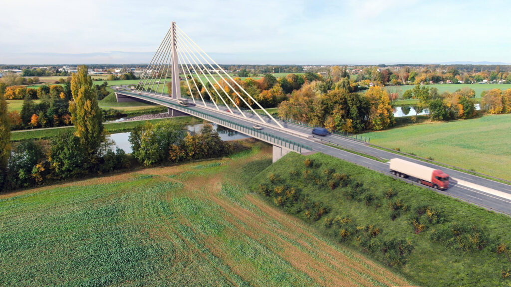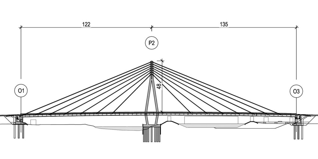 Jednopylonové mosty o dvou polích mají obvykle v jednom z polí stojku, která eliminuje problematiku malé tuhosti konstrukce mostu při nesymetrickém zatížení. V zadávacích podmínkách však byla možnost umístění stojky vyloučena. Aby se zvýšila celková tuhost mostu, je mostovka vetknuta do členěného pilíře pod pylonem. Na obou opěrách je most uložen na posuvných ložiskách a rovněž jsou zde dilatační závěry. Betonový pylon je rozkročený v podélném směru mostu, což příznivě působí na jeho namáhání, a vyztužení vychází v přijatelných hodnotách. Pylon byl oproti zadání snížen na 48 m nad mostovkou, lze tak zajistit přístup na jeho vrchol z běžné plošiny a působí i esteticky příznivěji.