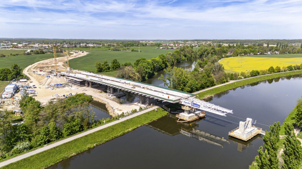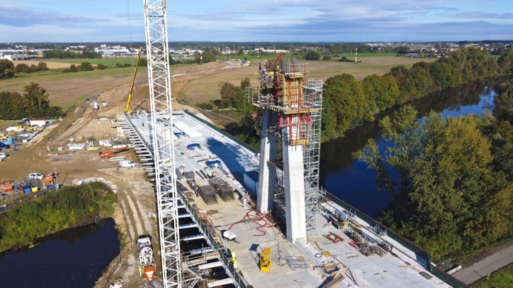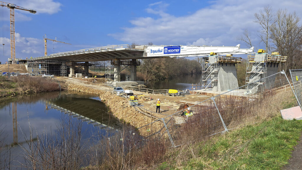 Mostovka se budovala technologií postupného výsuvu – během výsuvu ji podepíraly dočasné betonové podpory vzdálené maximálně 40 m. „Tuhost mostovky potřebná pro výsuv pak koreluje s malým počtem závěsů. Podélné předpětí potřebné pro výsuv nepřesahuje potřebu předpětí pro definitivní stav. Množství předpínací výztuže bylo ekonomicky vyváženo s potřebou lan pro závěsy, která jsou nákladnější než lana pro předpětí,“ pokračuje dr. Vítek. „Vzhledem k poměrně velkému svislému zatížení dočasných podpor a působení vodorovné síly od výsuvu se ukázalo vhodnější navrhnout podpory betonové. Založeny byly na březích na osmi velkoprofilových pilotách. Podpory založené v řece byly založeny na 32 ocelových HEB profilech, které se vetknuly do betonových pilot pode dnem. Při odstranění podpor předpokládáme, že ocelové profily odřízneme pod úrovní dna.“