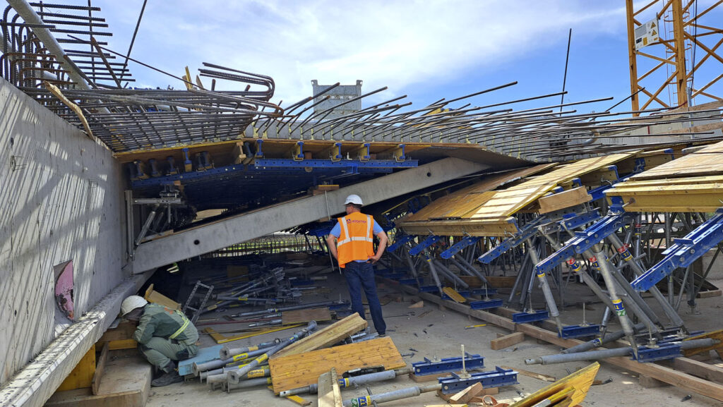 Ukloněné dříky jsou během výstavby vlivem působení vlastní tíhy namáhány ohybem. Aby se vliv průhybu elimininoval, byly ve dvou výškových úrovních dříky vzájemně rozepřeny vzpěrami s hydraulickými lisy tak, aby se dosáhlo jejich přímého tvaru. Následoval atypický díl, kdy se dva dříky spodní části pylonu spojily v jeden prvek. Poté se rekonfigurovalo šplhací bednění a pokračovala betonáž společného dříku.