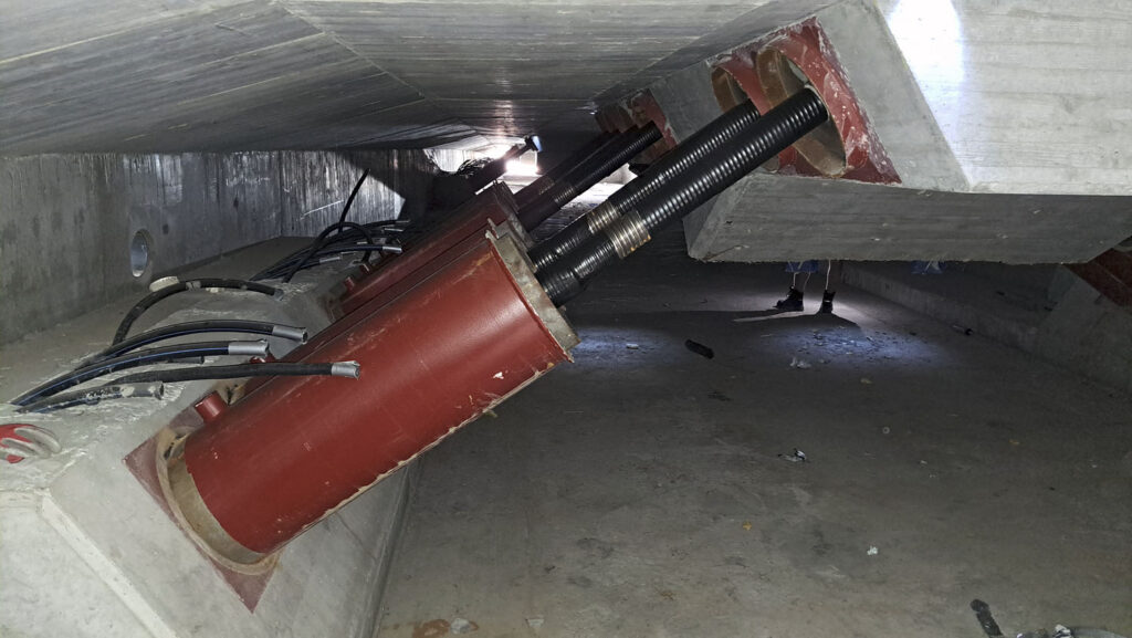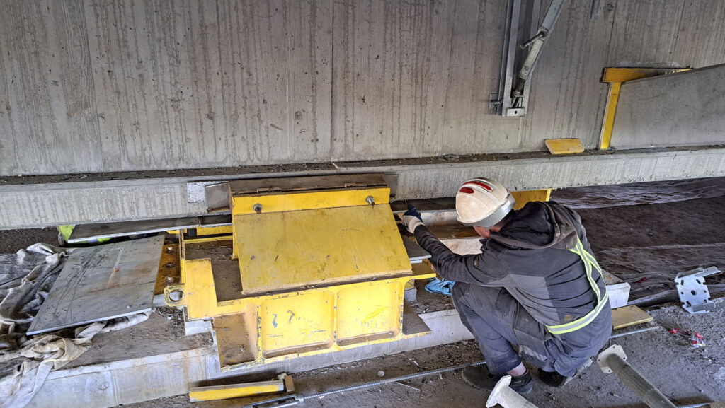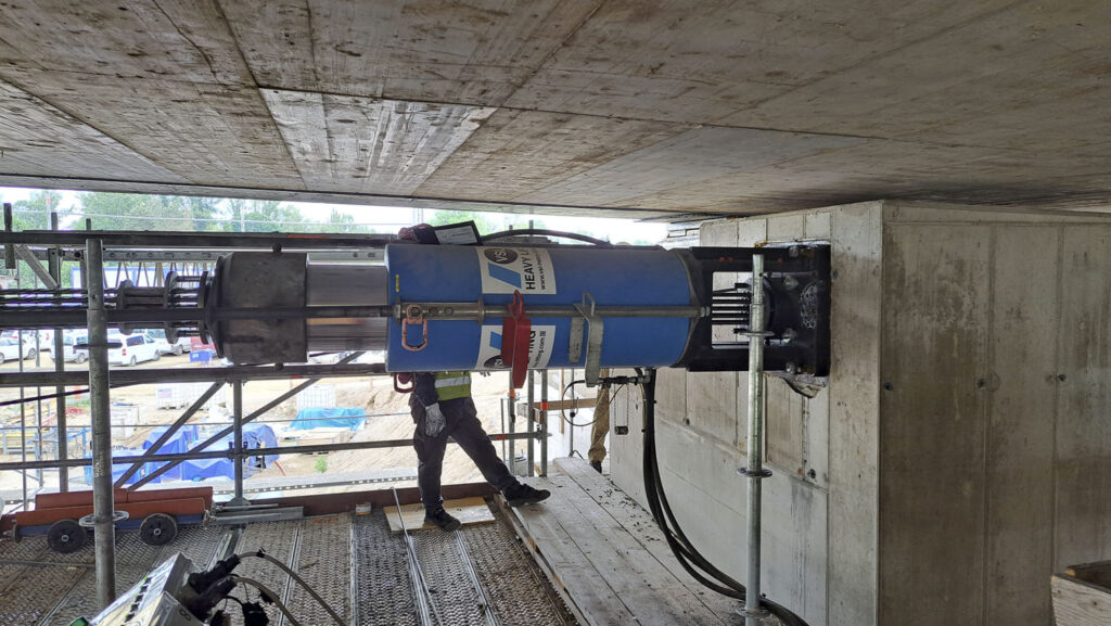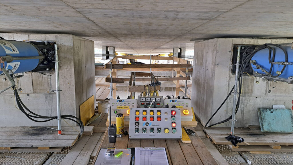 Výsuv zajistily dva duté hydraulické válce, které táhly svazek předpínacích lan. Ten byl zakotven do svislých ocelových trnů osazených na konci kompletní mostovky – tedy u předělu mezi výrobnami. Tažením lan se uvedla do pohybu celá, již vybetonovaná část mostovky o hmotnosti až 10 000 t. Hydraulické jednotky byly připevněny k dočasným betonovým pilířům připojeným k opěře.