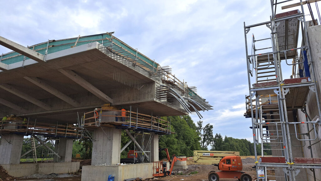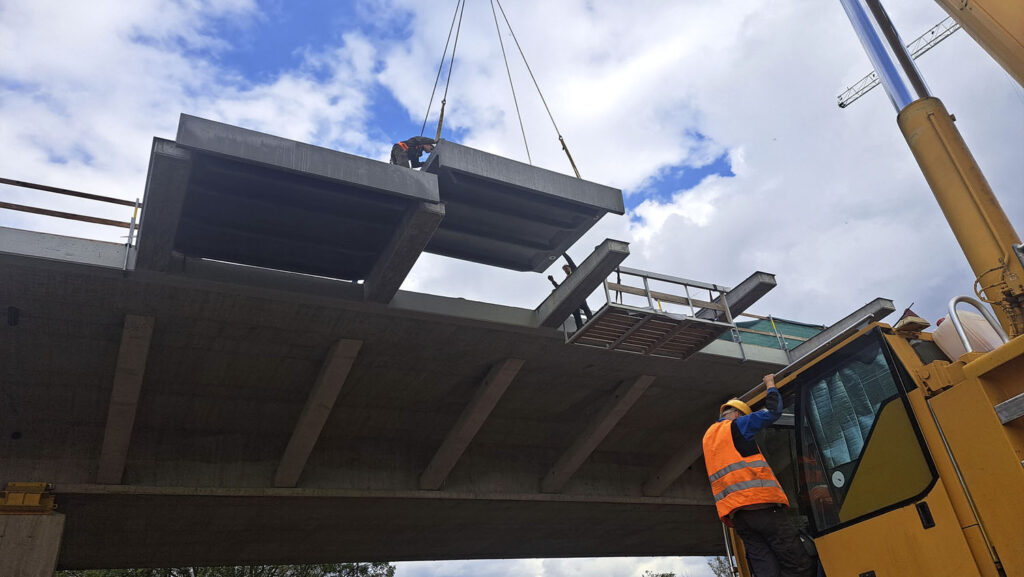 Následuje instalace mostní izolace, výstavba monolitických částí říms, vozovky, svodidel, protihlukových stěn a realizace dalších drobných prací.