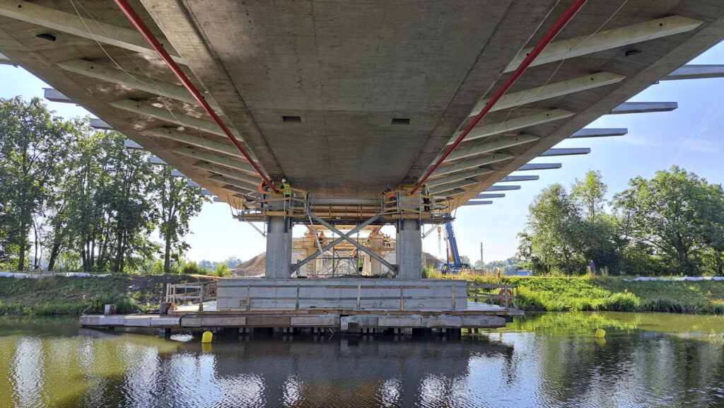 „Po ukončení výsuvu jsme přistoupili k betonáži příčníků. Po vybetonování příčníku nad levobřežní opěrou už byl umožněn příjezd na mostovku. Následovala betonáž dvojice podporových příčníků nad členěným středním pilířem, kde zároveň došlo k tuhému provázání mezi pilířem, mostovkou a pylonem. Jako poslední jsme betonovali mohutný příčník na pravobřežní opěře. V tomto příčníku je rovněž zakotven nejdelší závěs, což výrazně přispívá k tuhosti konstrukce,“ popisuje průběh prací Petr Vítek. „V této době už bylo třeba manipulovat s bedněním horní desky komory, proto byla zkompletována a předepnuta příčná táhla u kotev závěsů. Příčná táhla přenášejí vertikální síly závěsu do spodních partií komory pod stěny. Táhla jsou primárně betonová, předepnutá lanovým předpínacím kabelem uprostřed. Po obvodě je tenkostěnná ocelová trubka, která má funkci ztraceného bednění, ale zajišťuje i přenos příčných tahů vznikajících v táhle. Z důvodů montáže je trubka teleskopická.“