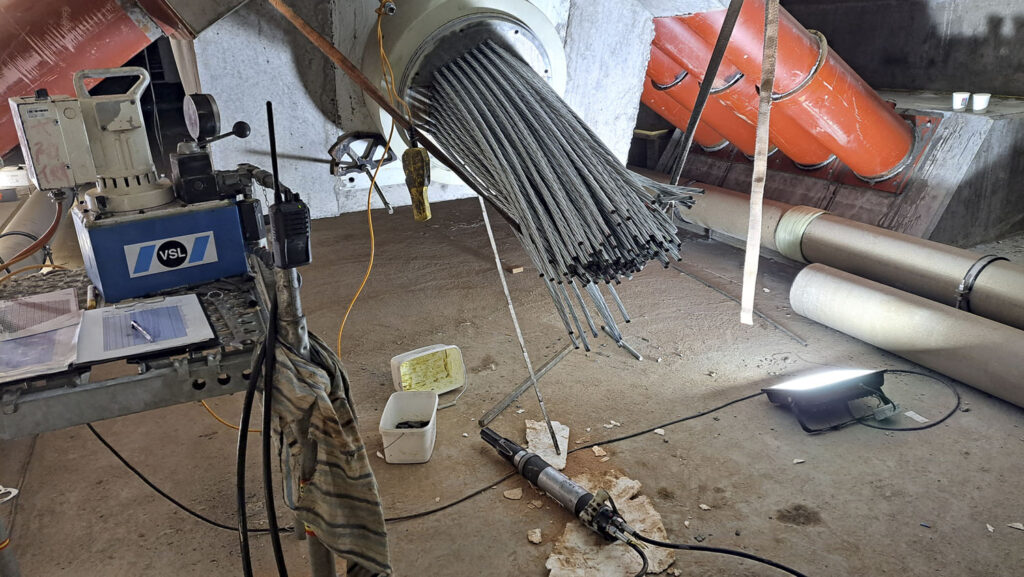 „V horní části pylonu bylo osazeno sedm sedel pro převedení závěsů přes pylon. Sedlo má ocelový plášť, vyplněný vysokohodnotným betonem, ve kterém jsou kanálky pro každé lano závěsu. Kanálky mají tvar obrácené kapky, aby se po napnutí mohlo lano zaklínit a dokázalo tak přenášet sílu z každé strany závěsu, do jisté míry rozdílnou. Výhodou je, že pylon namáhá zejména radiální síla působící pod sedlem. Není tedy potřeba přenášet kotevní síly závěsů, jak je tomu u jiných systémů. Dominantní radiální namáhání vyžaduje především vyztužení pod sedlem pro přenos příčných tahů, podobně jako pod ložisky,“ upřesňuje dr. Vítek a dodává: „Abychom mohli sedla uložit do přesné polohy, byl vyroben ocelový rám, do kterého se každé sedlo uložilo. Následovala instalace výztuže, přesun bednění a betonáž. Ocelový rám byl rovněž zabetonován a vytvořil tak tuhou podporu pro fixaci dalšího patra rámu s následujícím sedlem. Z důvodů kvalitního probetonování pod sedlem se využíval samozhutnitelný beton. Proces betonáže jsme ověřili na vzorcích skutečné velikosti.“