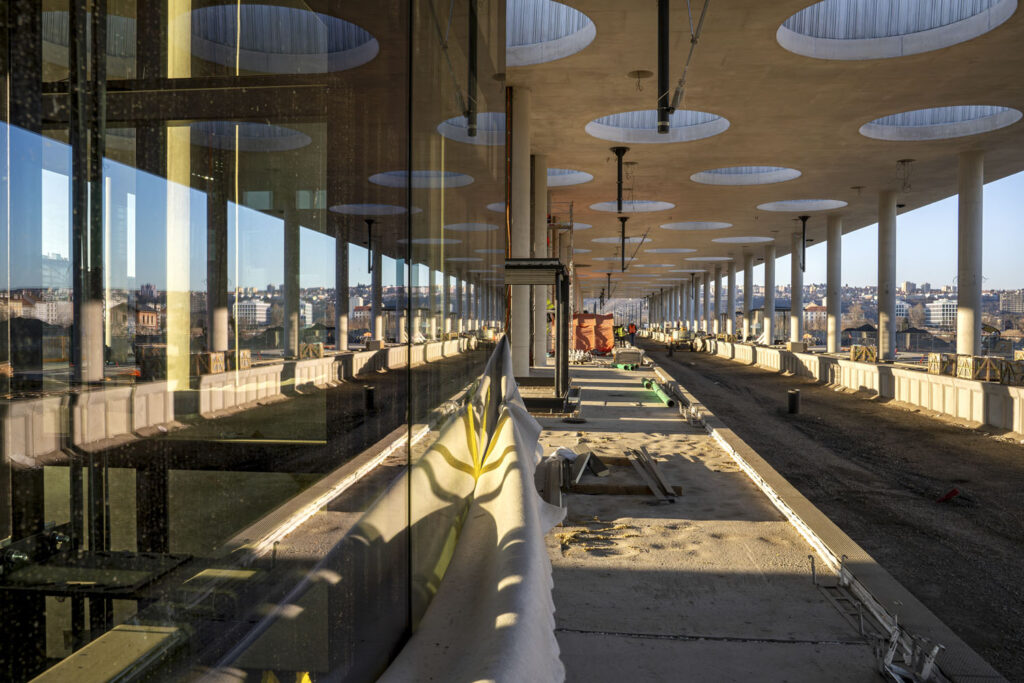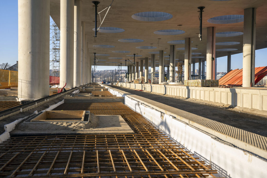 Všechny prvky zastřešení musely být dále provedeny z bílých pohledových betonů – za účelem dosažení co nejsvětlejšího odstínu byla technologem betonu navržena probarvená směs s vysokým stupněm příměsi pigmentu titanové běloby, což představovalo další výzvu pro provádění betonáže. Ocelové dílce bednění byly vyráběny na zakázku a stavba se musela vypořádat jak s komplikovaným postupem betonáže sloupů a střešních desek, tak s velice komplikovaným vyvazováním výztuže, zejména v místech jejích koncentrací na stycích silně vyztužených sloupů se skrytými průvlaky střešní desky.