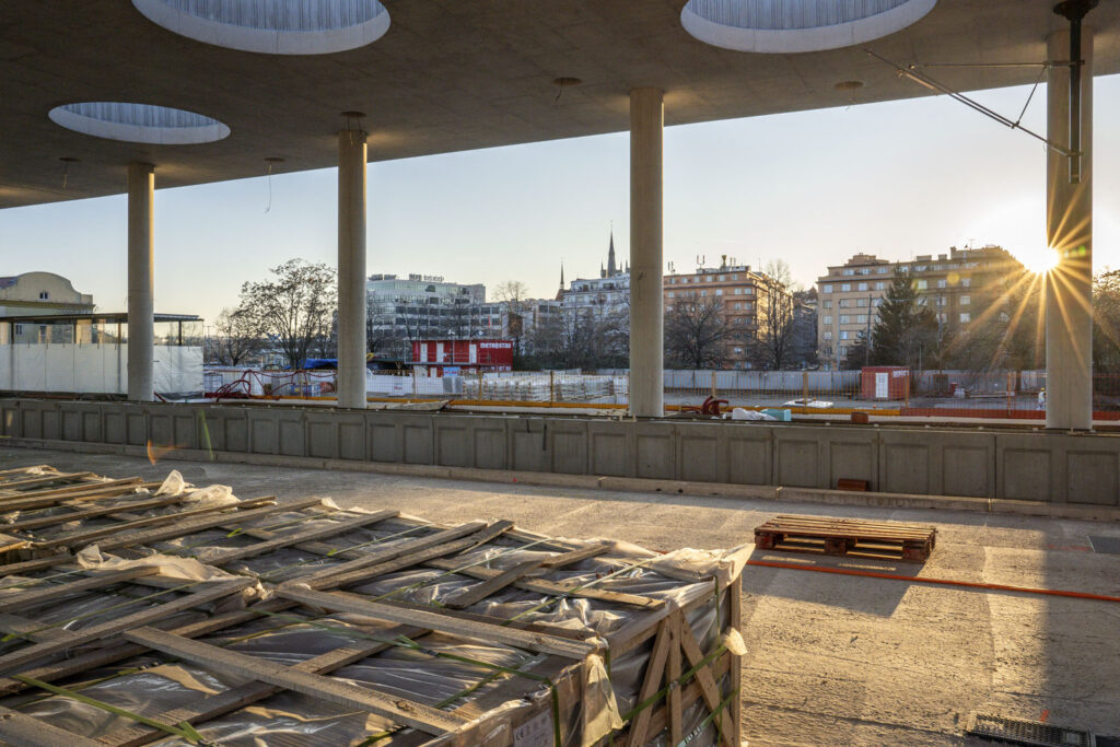 Úroveň vestibulů pod nástupištěm již obsahuje prvky z pohledového betonu, a to zejména sloupy kruhových, čtvercových a obdélníkových průřezů, které jsou v této úrovni provedeny z pohledových světlých betonů vyšší pevnostní třídy C50/60, s vysokými nároky na kvalitu provedení povrchů (PB3). Opěrné a další stěny jsou pak provedeny z betonů typičtější třídy C40/50. Vestibuly jsou umístěny v prostředním a dvou okrajových dilatačních celcích, mezilehlé dilatační celky jsou z větší části zasypány a jsou v nich umístěny pouze užší koridory, spojující vestibuly. V rámci zasypaných částí těchto mezilehlých dilatačních celků jsou umístěny samostatné mohutné základové paty sloupů zastřešení, podepřené vrtanými pilotami.
