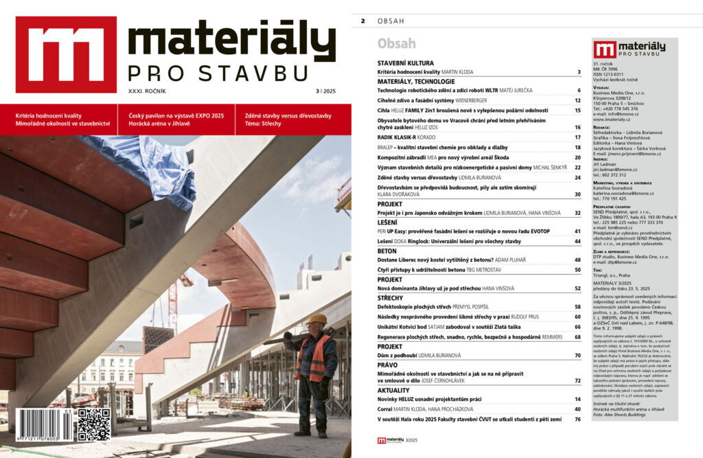 Ve čtvrtek 5. června vychází třetí letošní číslo časopisu Materiály pro stavbu, které jako vždy nabízí informace z různých oblastí stavebnictví. Čtenáři se mohou těšit na články o nových materiálech a technologiích, zajímavých projektech i o kvalitě stavební kultury a jak se připravit ve smlouvě o dílo na mimořádné okolnosti. Mezi hlavní témata patří nové technologie ve stavebnictví, jako je robotické zdění a použití chytrých materiálů pro zlepšení kvality staveb, srovnání zděných staveb a dřevostaveb, problematika správného provedení střešního pláště a novinky v oblasti lešení. Časopis podrobně rozebírá stavbu pavilonu EXPO 2025 v Ósace, projekt Horácké arény v Jihlavě a unikátní dům z podhoubí.