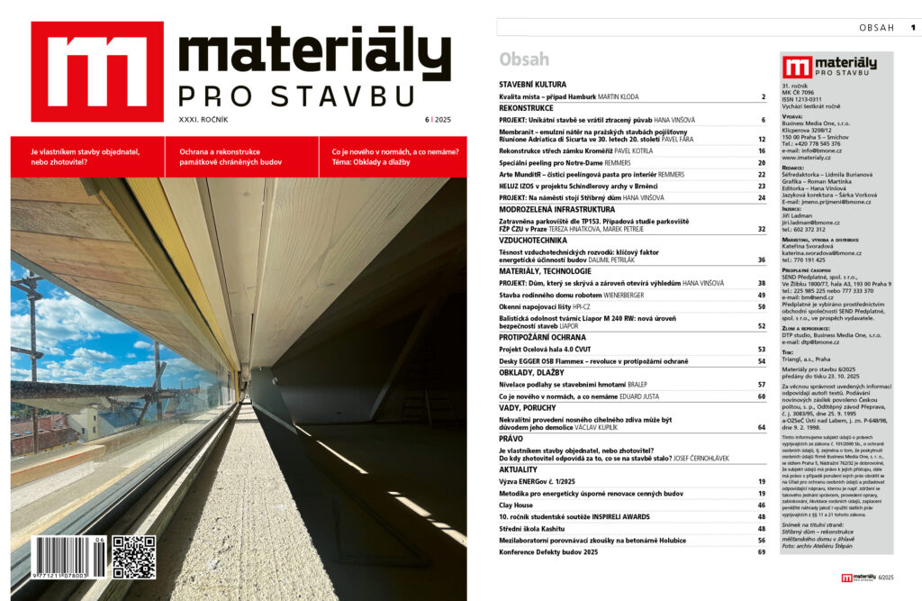 Vážení čtenáři, v pátek 31. října vyšlo letošní poslední číslo časopisu Materiály pro stavbu. V rubrice Stavební kultura vás Martin Kloda v závěrečném článku cyklu zve k zamyšlení nad kvalitou městského prostoru na příkladu Hamburku — příběhem inspirativním pro plánování a revitalizace i u nás. Sekce Rekonstrukce nabízí různé přístupy: článek „Unikátní stavbě se vrátil ztracený půvab“ popisuje záchranu a památkovou obnovu letohrádku Bellarie v areálu zahrady zámku Český Krumlov. Pavel Fára přináší technologicko-historickou sondáž do membranitních emulzních nátěrů na pražských objektech pojišťovny Riunione Adriatica di Sicurta ze 30. let 20. století a Pavel Kotrla sdílí zkušenosti z obnovy střech zámku Kroměříž. Článek „Speciální peeling pro Notre-Dame“ popisuje šetrné čištění vnitřních stěn katedrály po požáru v roce 2019. Další článek z rubriky se věnuje citlivé rekonstrukci Stříbrného domu z 13. století v Jihlavě. Dům měl směrem do zahrady v minulosti dvorní křídlo, proto na tomto místě autoři projektu obnovy – Ateliér Štěpán – navrhli kubickou přístavbu se závojem z nerezové tkaniny.