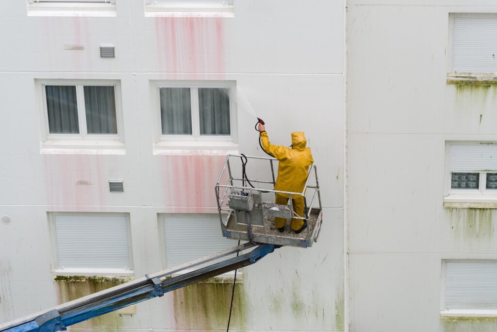 Ideálně za pomoci vysokotlakého zařízení s teplou vodou, případně páry nebo speciální trysky. Čisticí prostředek by měl být vhodný pro fasády a maximální tlak vody by neměl překročit 60 barů, aby nedošlo k poškození. Následně se fasáda důkladně opláchne a nechá zcela vyschnout. - Aplikace dezinfekčního prostředku