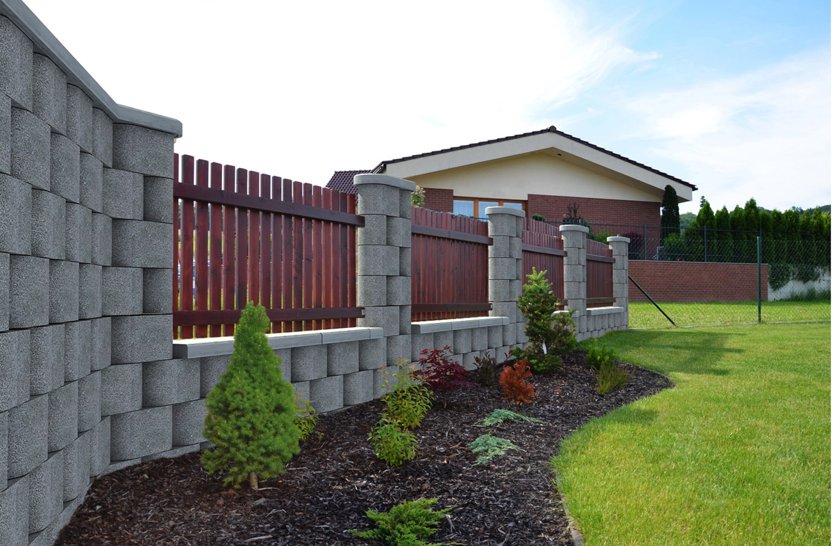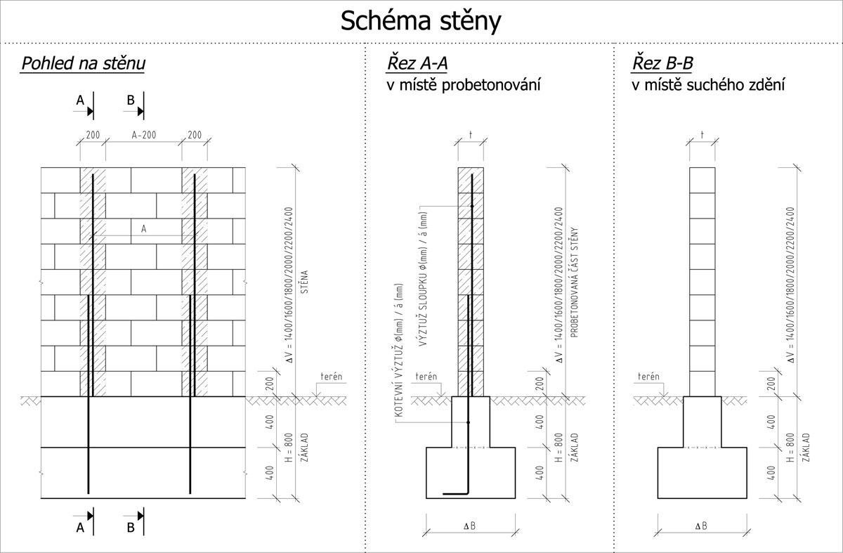 Z důvodu vyrovnání případných nerovností základového pasu se první vrstva tvarovek ukládá do maltového lože. Ostatní vrstvy je pak možné spojovat výše uvedeným způsobem.  Dle požadované výšky stěny a větrné oblasti je nutné zvolit průměr výztuže a vzdálenost integrovaných železobetonových (ŽB) sloupků (viz tabulka a obrázek níže). Díky tvarovému řešení tvárnic se svislé spáry spojovacím materiálem nevyplňují. Ukončující, tzn. poslední vrstva tvárnic a zákrytové desky musí být přilepeny. Stěny musí být vždy ukončeny probetonovaným sloupkem s vloženou výztuží. Obdobně musí být provedeno také ukončení v místě branky nebo v místě plotových výplní.  Kotvení brány je nutné řešit individuálně dle její velikosti a hmotnosti. V případě použití kovových vyrovnávacích a kotvicích přípravků pro montáž branky nebo výplní doporučujeme řešení pomocí pozinkované nebo nerezavějící oceli.