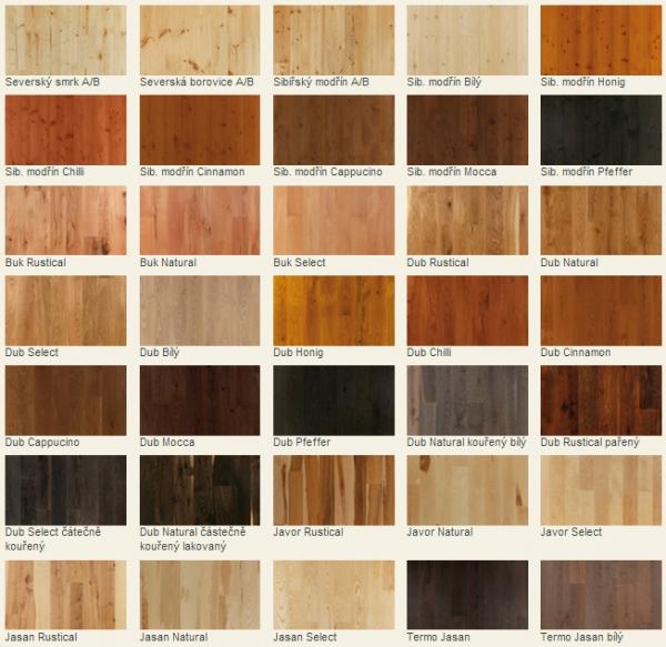 ● Modřín sibiřský – Patří mezi nejtvrdší jehličnaté dřeviny. Červenohnědé zbarvení v různých odstínech a výrazná kresba a hustota let vytvářejí jedinečný vzhled podlahy.