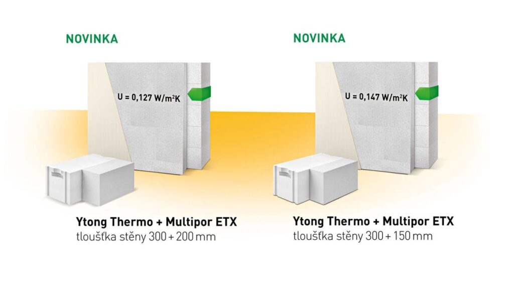 V kombinaci s nosným zdivem Ytong nebo vápenopískovými tvárnicemi Silka tak vznikají homogenní, minerální konstrukce s velmi nízkou hodnotou U a s dlouhodobě stabilními parametry. Například dvouvrstvá obvodová stěna z tvárnic Ytong Thermo tl. 300 mm doplněná o Multipor ETX tl. 200 mm dosahuje součinitele prostupu tepla U = 0,127 W/(m²·K), při tloušťce izolace 250 mm dokonce U = 0,112 W/(m²·K).