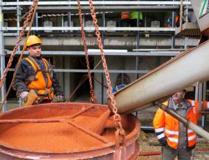 Celkem 100 m3 betonu bylo do nosníkového bednění Vario postupně nalito skrz 29 plnicích otvorů. Jednotlivé oválné bubliny v počtu 40 kusů byly v bednění vyvázány ze sololitu, hustá výztuž o váze 30 tun prochází mezi jednotlivými otvory.
