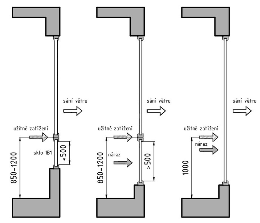 Poloha příčníku v pevně prosklených okenních stěnách a lehkých obvodových pláštích se neurčuje podle výše uvedených kritérií, ale podle úrovně působení vodorovného užitného zatížení na svislé konstrukce, uvedené v národní příloze ČSN EN 1991-1-1. Lineární užitné zatížení se uvažuje ve výšce v rozmezí 0,8–1,2 m, pro požadavky výpočtu se obvykle aplikuje ve výšce 1,0 m nad čistou podlahou. Pod touto úrovní musí být případná skleněná výplň odolná proti nárazu jako zábradelní výplň.