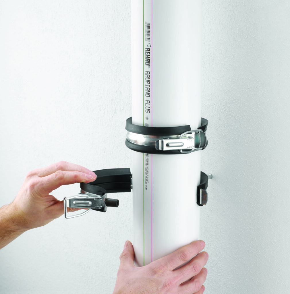 Kvalitní materiál potrubí pro odpadní systém by pravděpodobně na eliminaci hluku sám nestačil. Významným aspektem je také technologie upevnění potrubí v šachtách bytového domu. Výrobce potrubí REHAU k tomuto účelu navrhl technologii upevnění RAUCLAMP. Jedná se o speciální dvojitou zvukově-izolační objímku, která díky svým vlastnostem a pružnému materiálu absorbuje veškerý hluk, jenž by se přenášel do pevné konstrukce budovy. Pro ilustraci dvojitá objímka RAUCLAMP NC při průtoku 4 l/s vykazuje hlučnost pouhých 13 dB. Pokud by se ale použila jednoduchá objímka RAUCLAMP FIX tak bude úroveň hluku na hladině 21 dB. Je důležité připomenout, že součástí systému RAPIANO PLUS jsou optimalizované tvarovky, které svou konstrukcí a materiálem (jak bylo vysvětleno výše) přispívají k hlukovému útlumu. Je třeba dodat, že potrubí odolává spolehlivě nejen chemicky agresivní vodě, ale i teplotám do +95 °C (myšleno krátkodobě). Spoje jsou spolehlivě těsné do vnitřního přetlaku 0,5 baru.