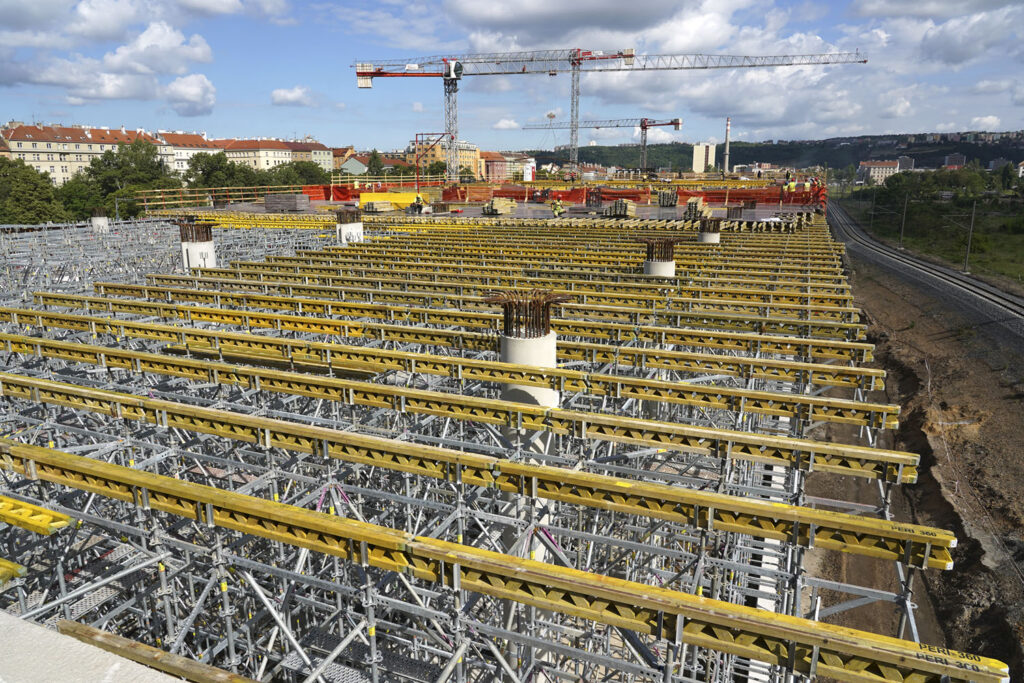 Základy objektu, které jsou rozloženy po celé délce budoucí stanice, musely být navrženy s ohledem na plánovanou až šestipodlažní nástavbu. Vyznačují se robustností a důrazem na rovnoměrný přenos zatížení do podloží, aby se předešlo nerovnoměrnému sedání. Pro jejich realizaci byl využit systém DOMINO, který díky výhodnému poměru hmotnosti a únosnosti umožnil efektivní manipulaci a vysokou kvalitu výsledného betonu. Stejný systém byl využit i pro bednění čel stropních desek o tloušťce 80 cm, které budou sloužit jako mostovky pro pojezd vlaků a zároveň jako konstrukční základ pro nástupiště.