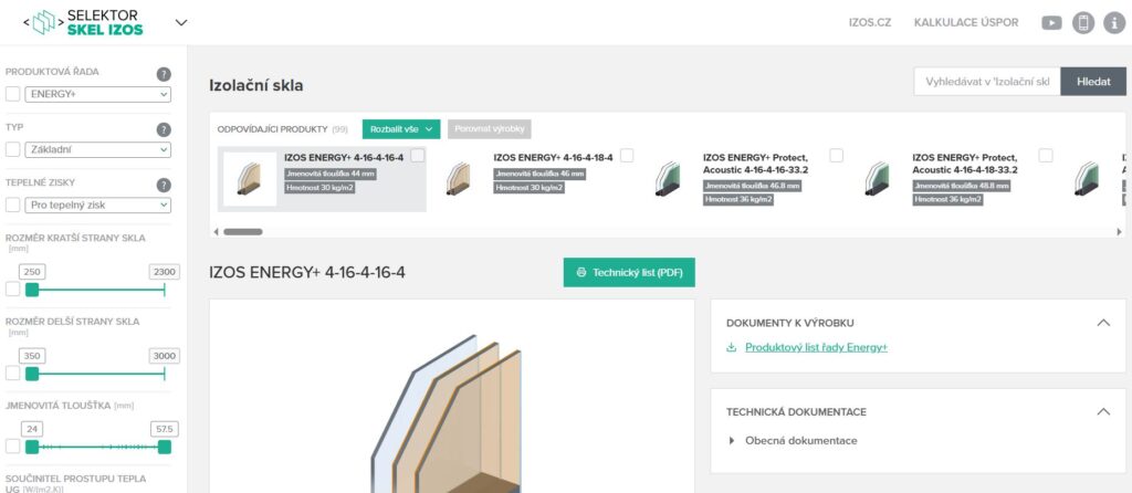Selektor skel představuje propracovanou databázi zahrnující téměř sto typů izolačních skel IZOS. Data jsou průběžně aktualizována, což zajišťuje, že uživatelé pracují vždy s nejnovějšími technickými parametry. Díky intuitivnímu filtrování lze rychle vyhledat vhodné zasklení podle celé řady kritérií – od tradičně sledovaného součinitele prostupu tepla Ug až po světelnou propustnost, akustické vlastnosti, bezpečnostní parametry či energetické charakteristiky.