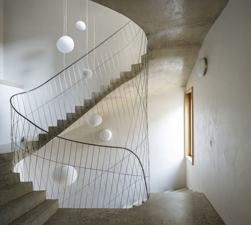 Interiér stavby pokračuje v duchu střídmosti a precizního detailu. Charakter prostoru určují pečlivě zvolené materiály a řada prvků vyráběných na míru. Nepřehlédnutelné jsou stropy z bílého pohledového betonu s otisky nehoblovaných prken, které vytvářejí přirozený kontrast k teplým dubovým podlahám. „Dominantním prvkem veřejných prostor domu je eliptické schodiště s jemným ocelovým prutovým zábradlím, jehož spirálovitě rozvinutá hmota působí jako skulptura, která elegantně propojuje jednotlivá podlaží,” uvádí architekt Ladislav Lábus.