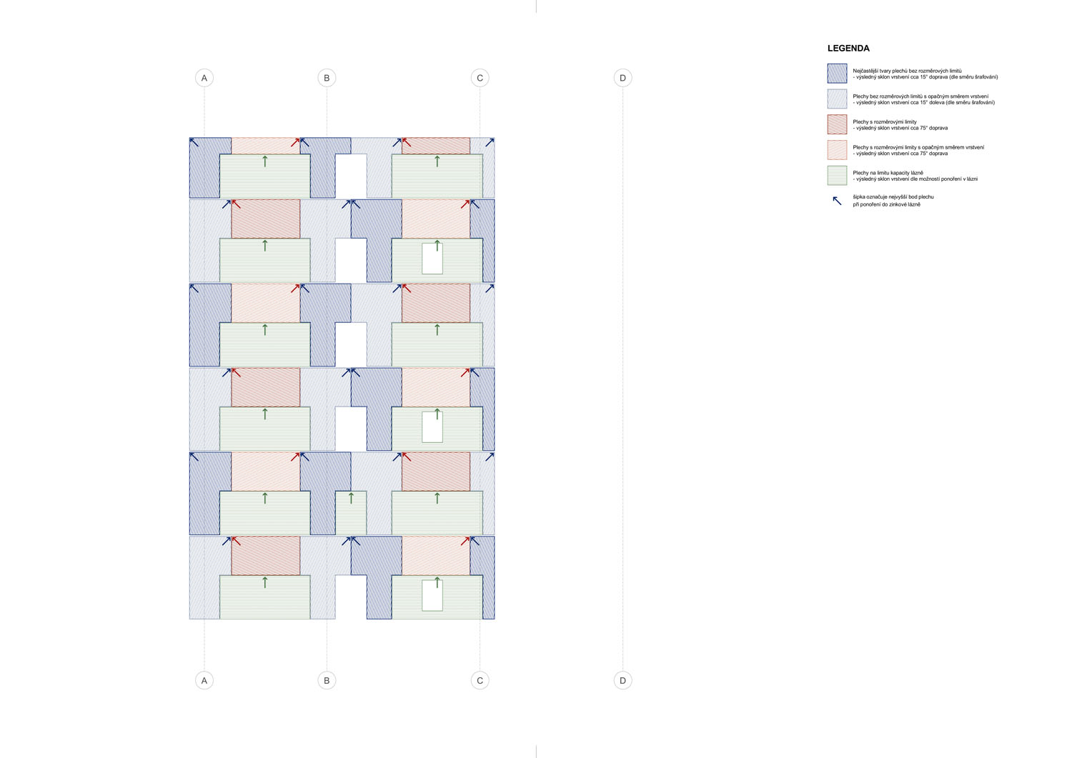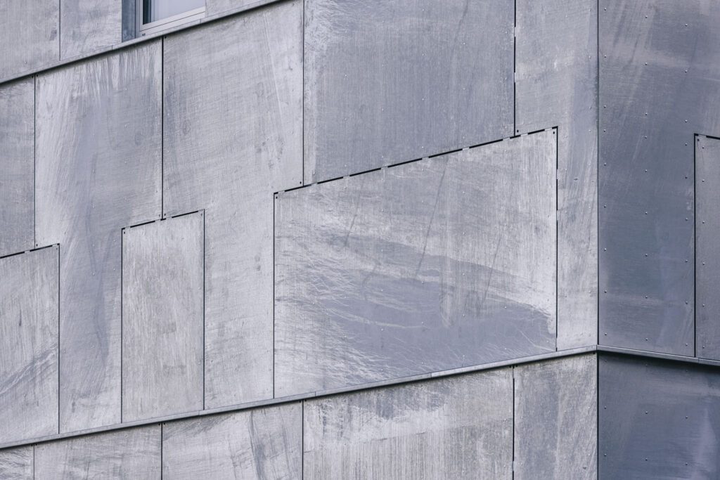 Samotný proces žárového zinkování primárně neslouží pohledovým účelům velkých exponovaných ploch. Mramorová textura, která je nyní na několik prvních měsíců či let na plechách vidět, vzniká orientací plechu při máčení do zinkové lázně. Součástí návrhu proto byla přesná orientace máčení jednotlivých plechů, aby výsledné žilkování na fasádě tvořilo šachovnici. Drobné kazy, které nemají vliv na kvalitu zinkové ochrany plechů, ale pohledově jsou viditelné, architekti naopak vítali, stejně jako stopy přirozených nečistot v lázni. Tyto drobné chyby jsou z architektonického hlediska vítaným zpestřením fasády, nezakrývají živost a přirozenost procesu zinkování.