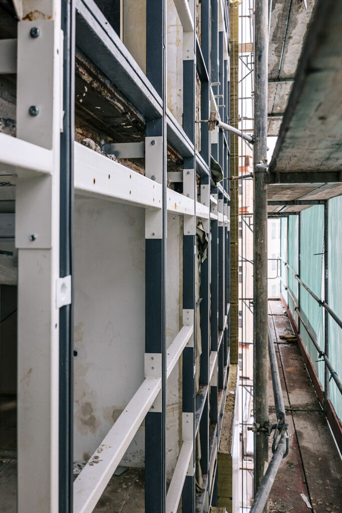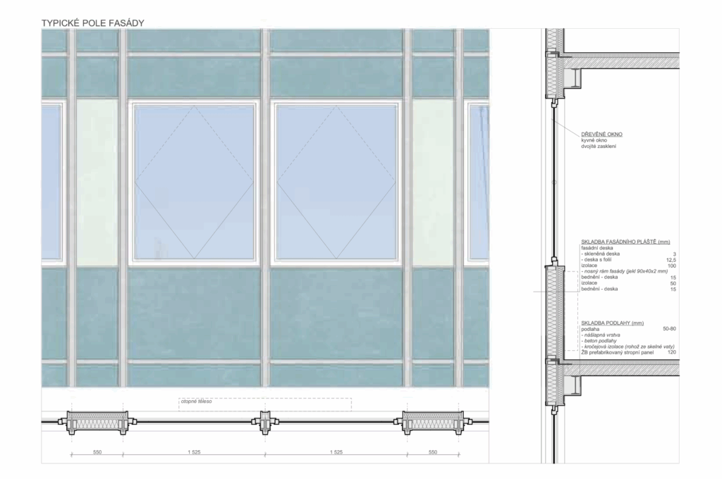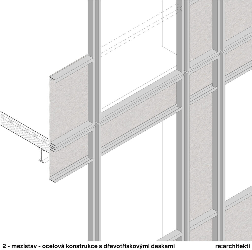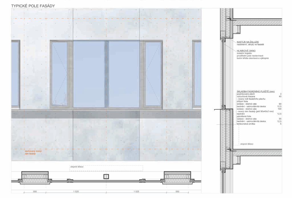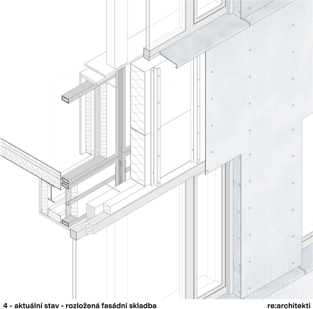 „Z důvodů ekonomiky celého projektu jsme se rozhodli zachovat rámy boletických panelů z uzavřených jeklů včetně jejich ukotvení ke stropním konstrukcím. Po demontáži dalších vrstev původního pláště proběhla revize a vyspravení rámů, zejména zkorodovaných styčníků v nadpraží a parapetu oken. Oproti tomu hlavní jeklové rámy byly až na několik výjimek v místech, kde zatékalo, zcela v pořádku, včetně původního nátěru, tj. po 50 letech a při tloušťce profilu 2 mm. Vzhledem k navýšení celkové hmotnosti fasády, už především kvůli oknům s trojsklem, a také aktuální legislativě, bylo nutné posílit statickou vazbu nosné konstrukce s fasádou novými ocelovými kotvami. Následně byly původní rámy ošetřeny nátěrem, vyplněny tepelnou izolací, z exteriéru přibyla další významná část tepelné izolace formou fasádních panelů. Celá konstrukce je provázaná až k vertikálním Z profilům, na které jsou navěšeny fasádní plechy,“ upřesňuje Jiří Žid.