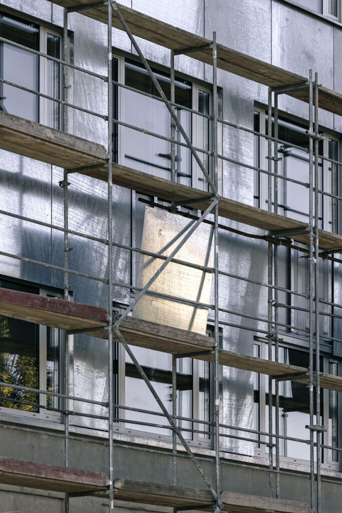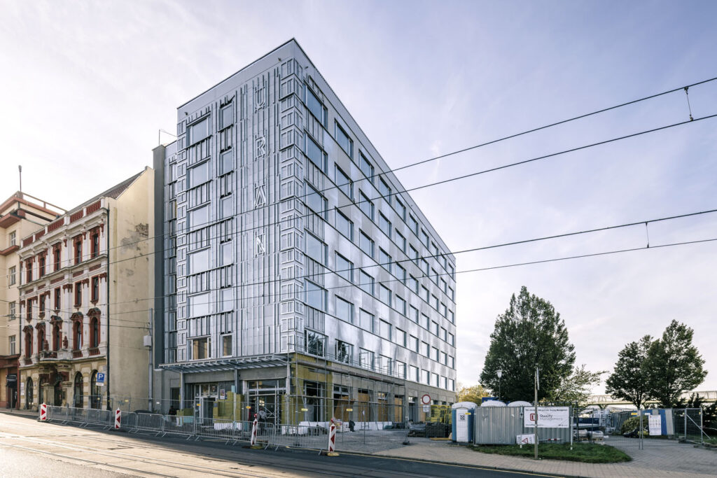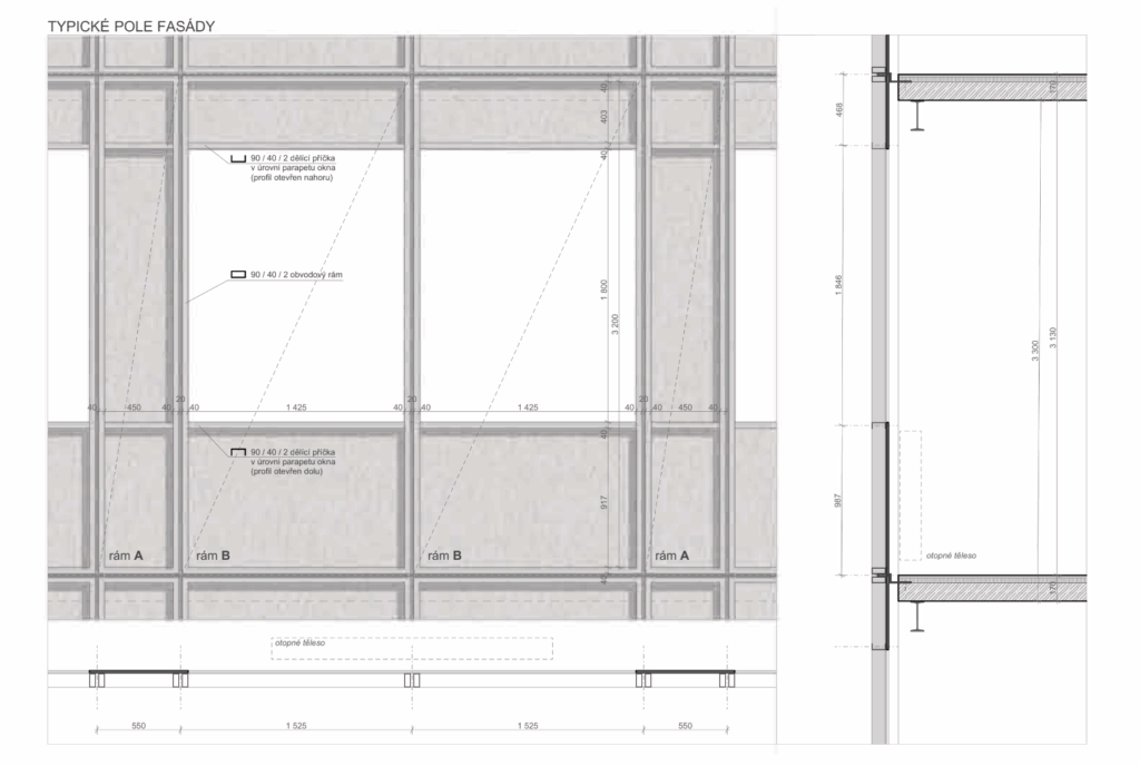 „Když jsme přemýšleli o žárově zinkovaném plechu, ověřovali jsme si toto řešení na referenčních stavbách, například na budově Aquilla od ateliéru Christ a Gantenbein. Během návrhu jsme nechali zhotovit vzorky plechů v měřítku 1:1, abychom si ověřili realizovatelnost a vliv tvaru a metody ořezu na proces žárového zinkování. Bylo to důležité především u velkých profilů T tvaru – jejich délka dosahuje 3,3 m a jsou tak výrazně větší než na dostupných zahraničních referencích. Plechová fasáda zároveň tvoří masku celého technického řešení, detailů kolem oken a technických spojů fasády,“ uvádí architekt Jiří Žid.