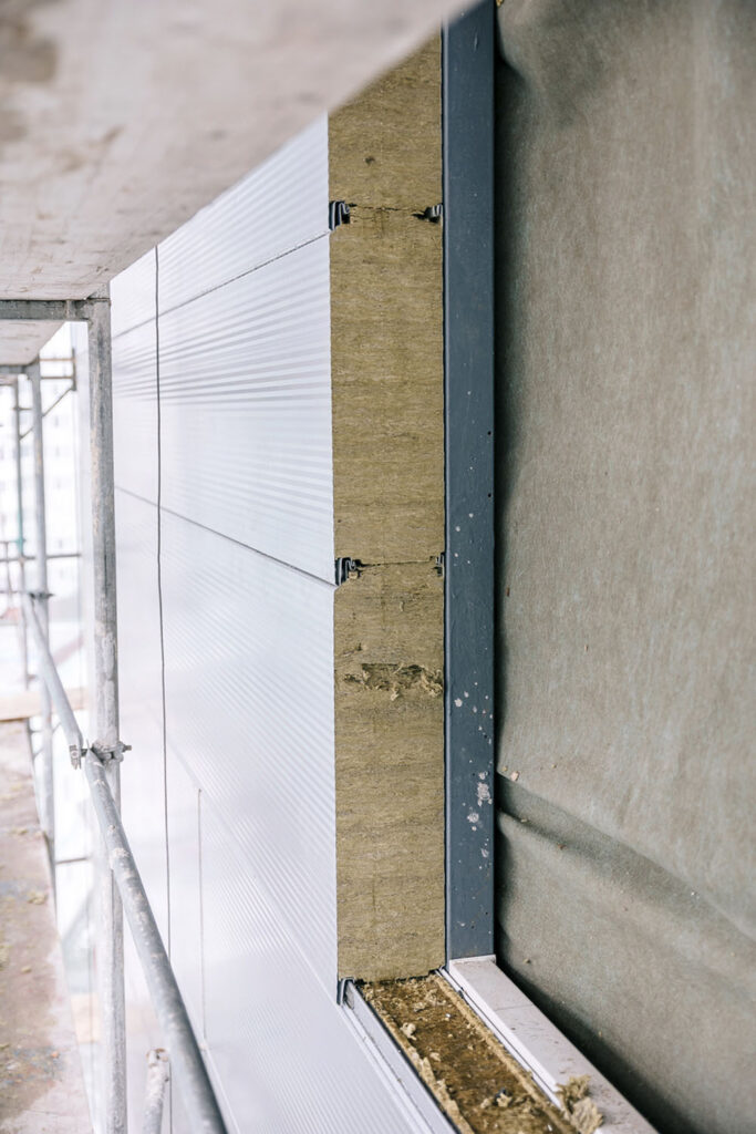 Konstrukční řešení spočívalo ve využití sendvičových panelů Kingspan flex (modul šířky 600, 750 a 900 mm), z kterých lze sestavit kladečský plán bez dořezávek na stavbě. Okenní výplně tu jsou přes dvě hlavní rámová pole původní fasády, což se řešilo předsazenou montáží. Významné přitížení stávajících rámů a zejména jeho přenesení do konstrukce ocelového skeletu vedlo statika k rozsáhlým zásahům. Kingspan panely zpravidla nevyžadují zásadní úpravu, v tomto případě však bylo třeba řešit pomocné ocelové ztužující prvky, aby mohl být pod 3 mm silné pozinkované plechy vyvěšen nosný rastr ze Z profilů. Excentricita vlastní skladby neprůhledné části pláště i velkoplošná okna s trojskly v hliníkových rámech navíc vyžadovaly podchycení zachovaných rámů fasády. Na nosný rastr se pak v přesně definovaných řadách a speciálními šrouby kotvily velkoplošné plechy. Šrouby mají nejen speciální separační podložku, ale i silikonové pouzdro, vložené do otvoru v plechu. Kromě eliminace vzniku galvanického článku umožňuje dilatování při teplotních změnách. Projektová dokumentace tedy obsahovala řadu detailů, konstrukčních vazeb, spárořezů a dalších zadávacích kritérií a podmínek pro realizaci.