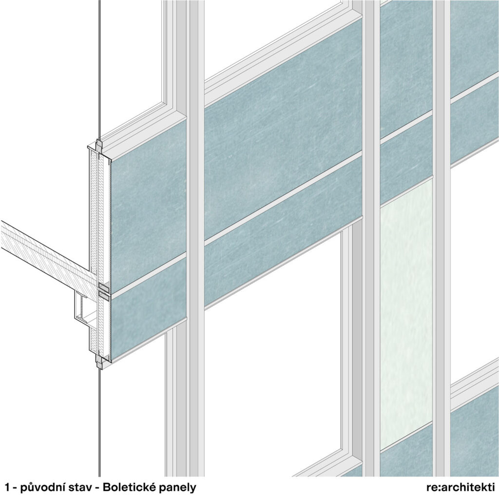 „U nosného systému budovy z montovaného ocelového skeletu jsme nenašli poruchy nebo závady, to se ale nedalo říci o jejím opláštění z boletických panelů. Objevily se na nich známé a hojně se vyskytující poruchy, zejména praskající smaltovaná skla, zatékání, netěsná okna, špatné tepelně technické parametry. Nepůsobily důstojným dojmem, navíc se muselo zbudovat ochranné lešení pro bezpečnost kolemjdoucích před odpadávajícími částmi. Naštěstí se nám podařilo uhájit názor, že budova nemá žádné zásadní problémy a je tedy třeba se zaměřit na obálkové konstrukce. S tím pak souvisely změny a úpravy na technických zařízeních jako je vytápění, chlazení a větrání,“ vzpomíná Ing. Zeman. Dodává: „Potěšilo mě, když jsem byl architekty osloven, abych se na základě svých zkušeností s realizacemi sanací lehkých obvodových plášťů stal členem projekčního a realizačního týmu. Na rozdíl od „běžného“ řešení byl ale jejich požadavek na projekt nového opláštění podstatně složitější, navíc nerespektoval stávající modulové členění. Nakonec jsme to přijali jako výzvu, která se pak na každém kroku projevila jako ještě komplikovanější. Základním předpokladem bylo využít rámy dílců boletických panelů. Průzkumné práce a sondy potvrdily obavy z lokálního zatékání, zejména jihozápadního nároží a přilehlých fasád. Zároveň se ale vyloučila přítomnost azbestových vláken v deskových výplních.“